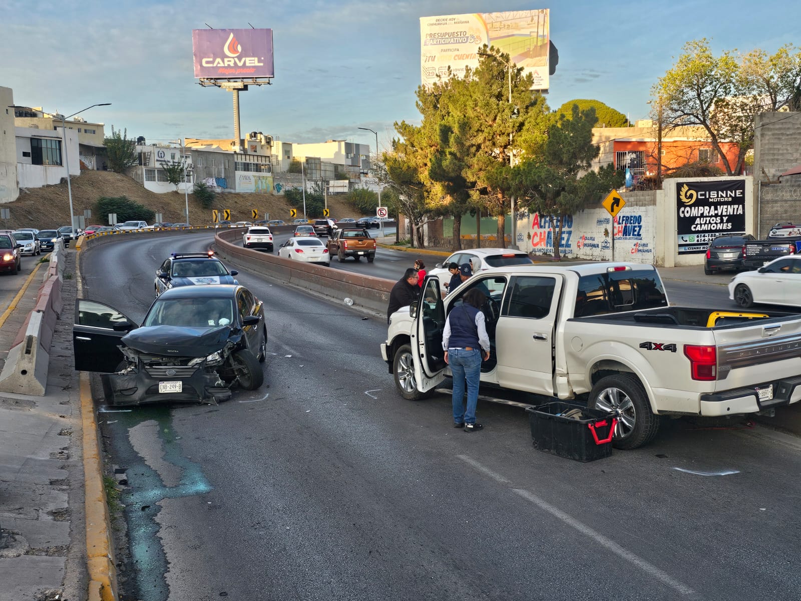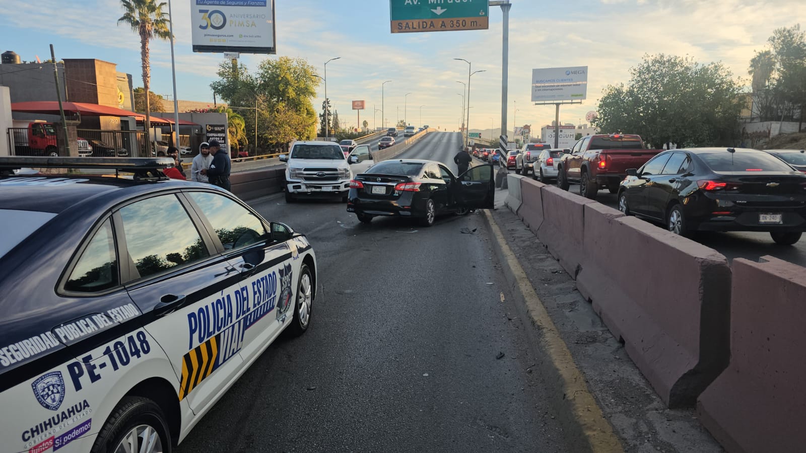 Chihuahua.- Un aparatoso accidente ocurrió en “la curva de los choques” de la avenida La Cantera, justo antes de subir el puente que cruza la Avenida Washington, en sentido de oeste a este.
