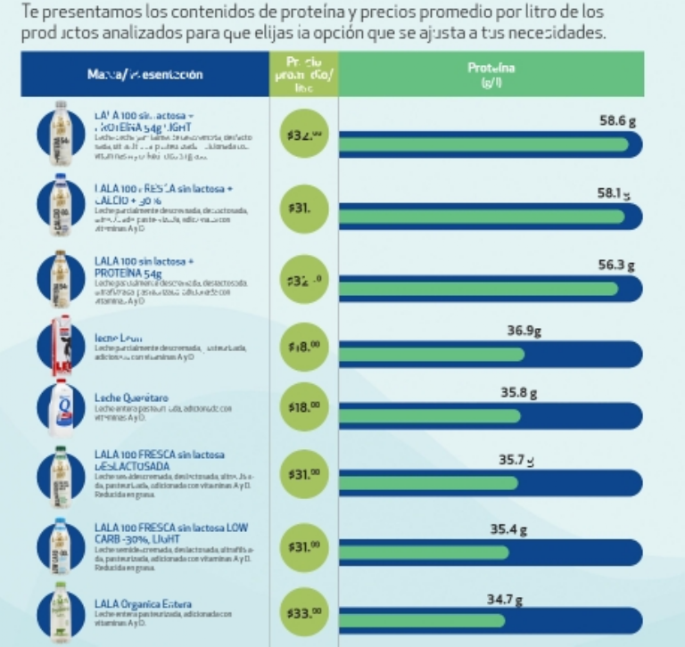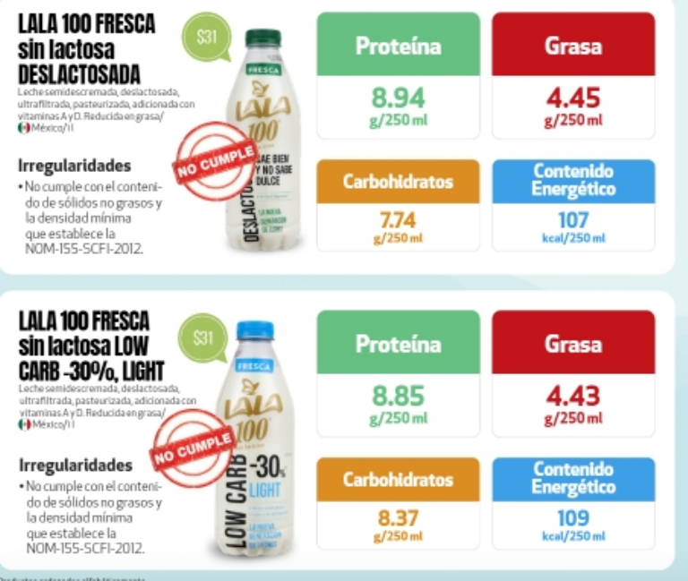 - Lala 100 fresca sin lactosa deslactosada: no cumple con el contenido de sólidos no grasos y la densidad mínima que establece la NOM-155-SCFI-2012