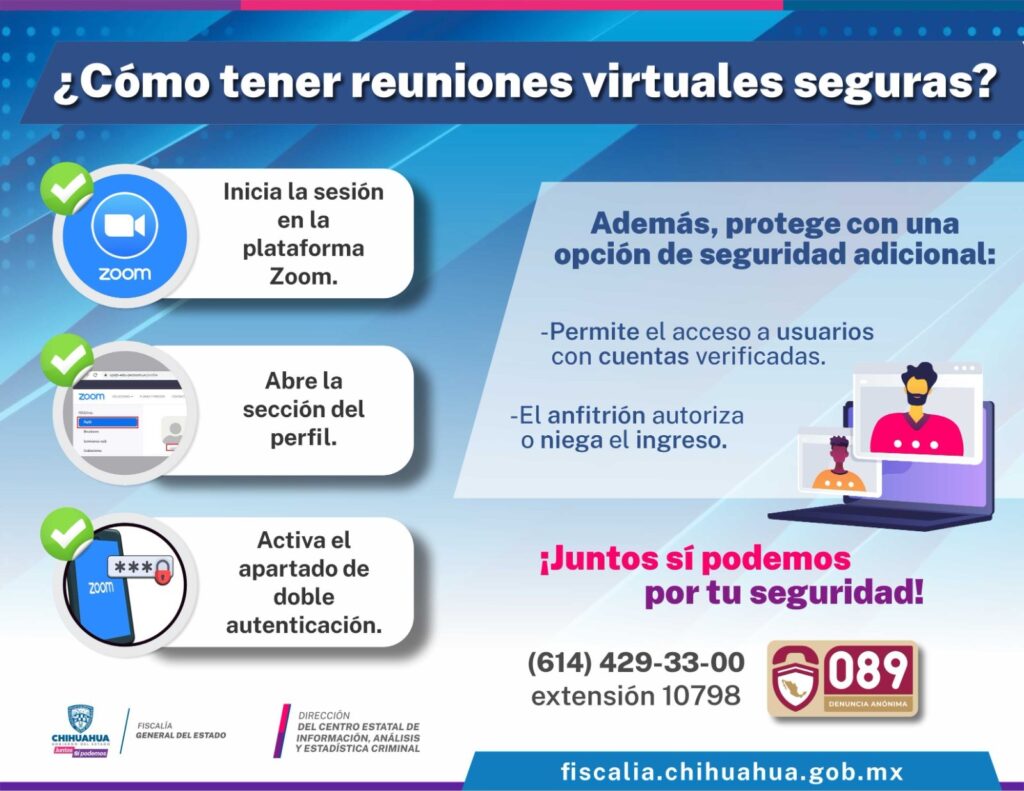 Chihuahua.- La Fiscalía General del Estado, a través de la Dirección de Análisis de Evidencia Digital e Informática Forense, emite una serie de recomendaciones a fin de brindar mayor seguridad en videoconferencias o reuniones virtuales.