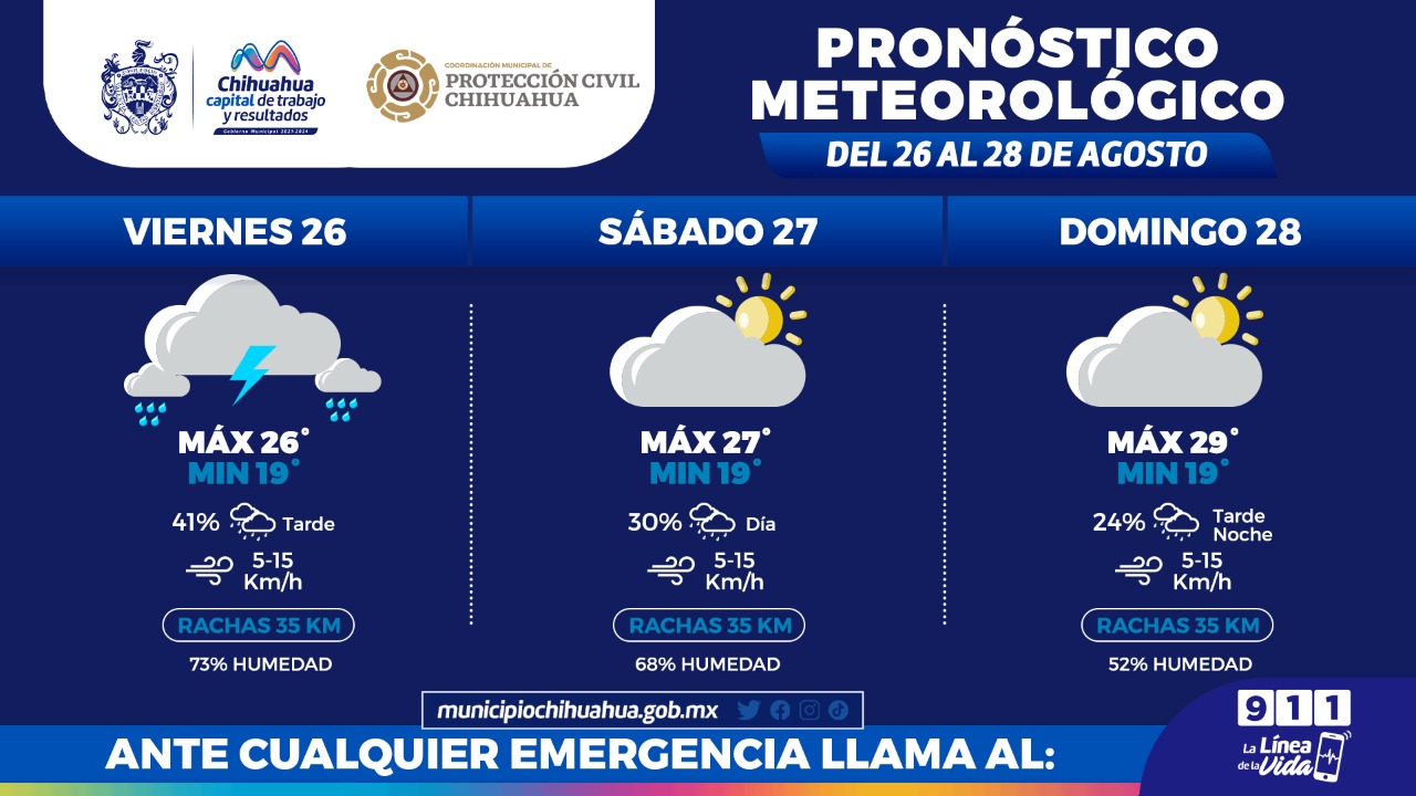 De acuerdo al pronóstico que emite el Servicio Meteorológico Nacional de CONAGUA, para este viernes se espera una máxima de 25°C y una mínima de 18°C con vientos de hasta 35 kilómetros por hora, un cielo nublado, con tormentas eléctricas y un 100 por ciento de probabilidad de lluvia.