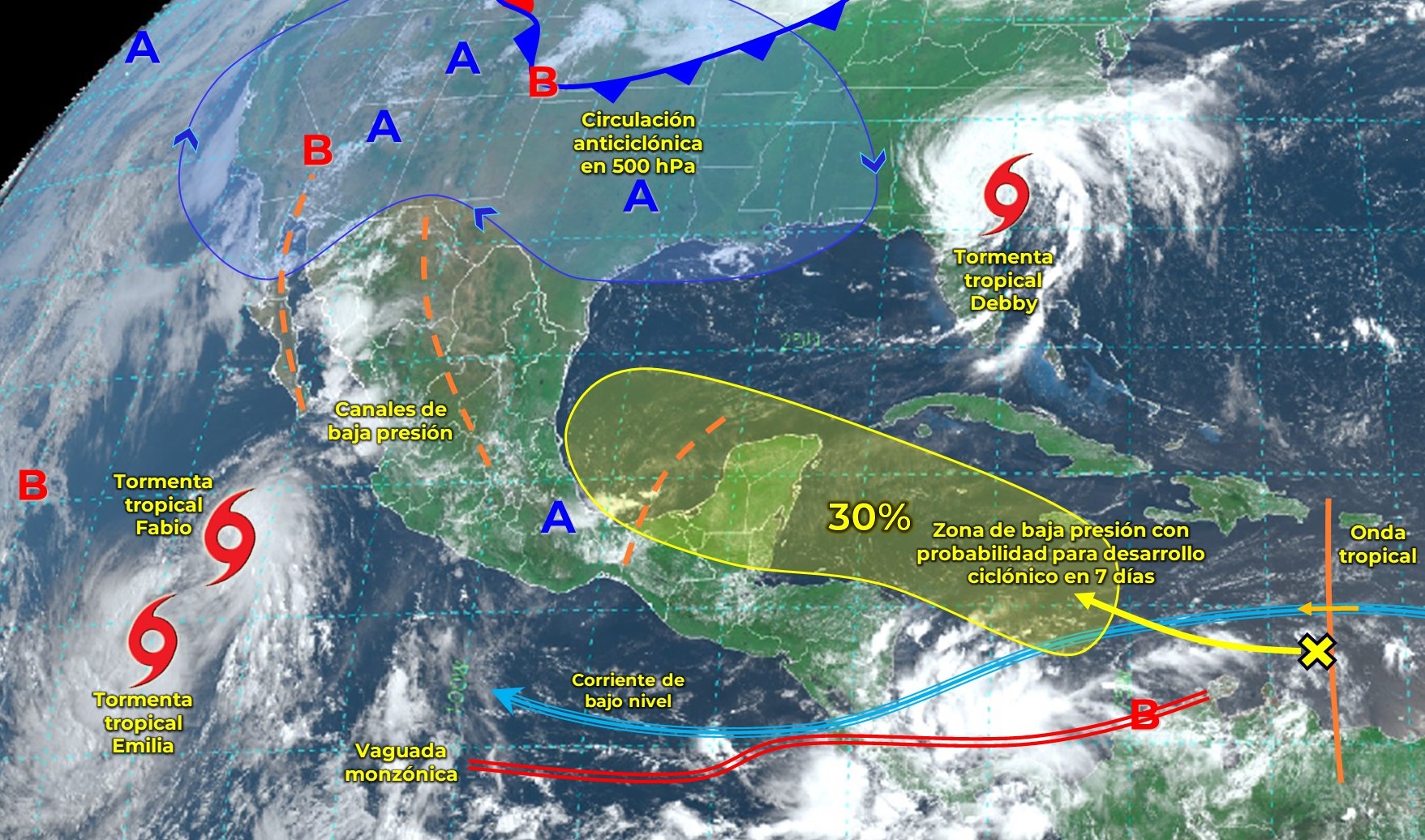 Estos factores se asocian al monzón mexicano, en combinación con inestabilidad en niveles altos de la atmósfera, canales de baja presión al interior del país y el ingreso de humedad tanto del Océano Pacífico como del Golfo de México.