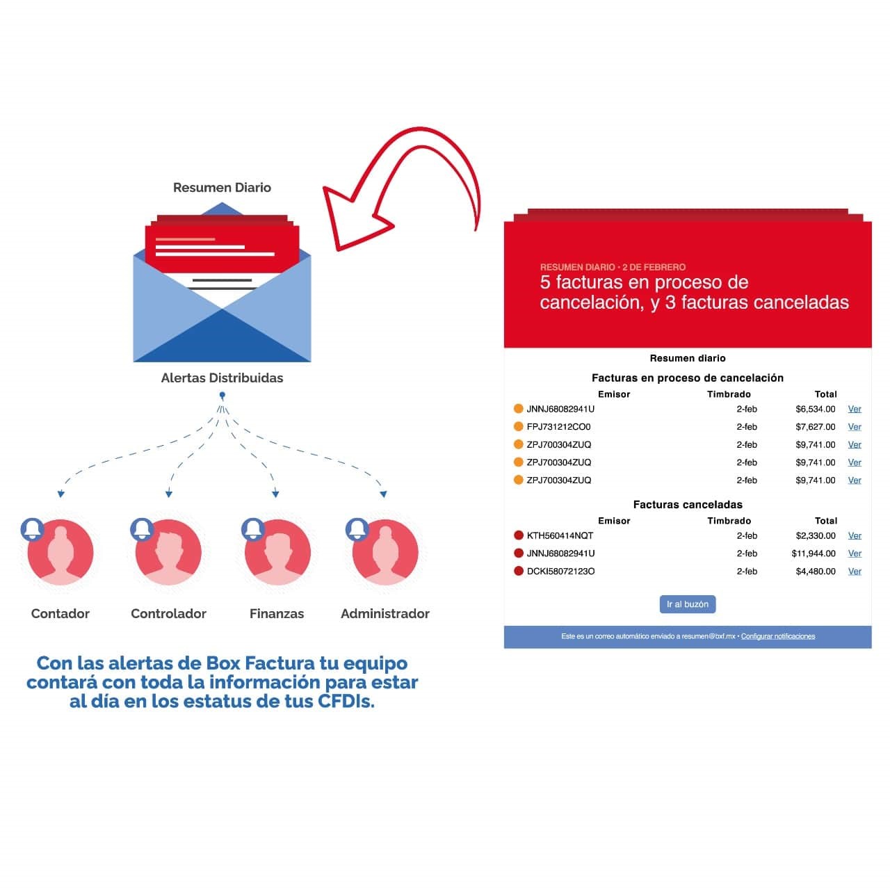 • Resumen diario de cancelaciones: alertas de facturas canceladas o en proceso de cancelación, se distribuyen a todo tu equipo de trabajo.