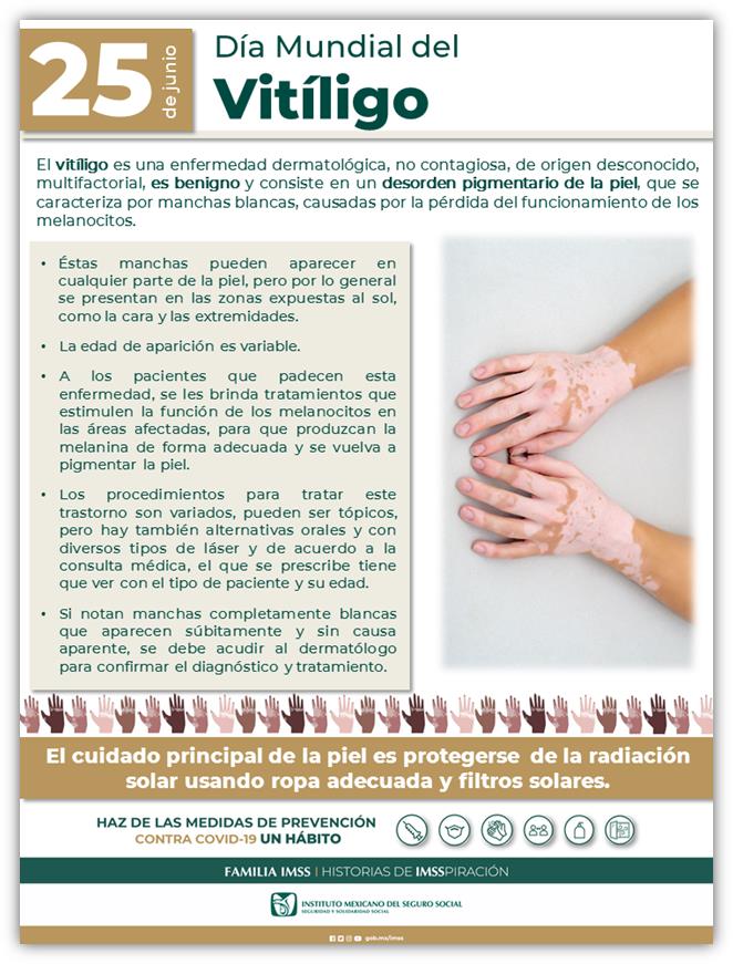 Detalló que en la mayoría de los casos comienza como pequeños lunares a partir de los 10 años de edad y se manifiesta por la aparición de manchas blancas que resultan de la ausencia del pigmento en la piel.