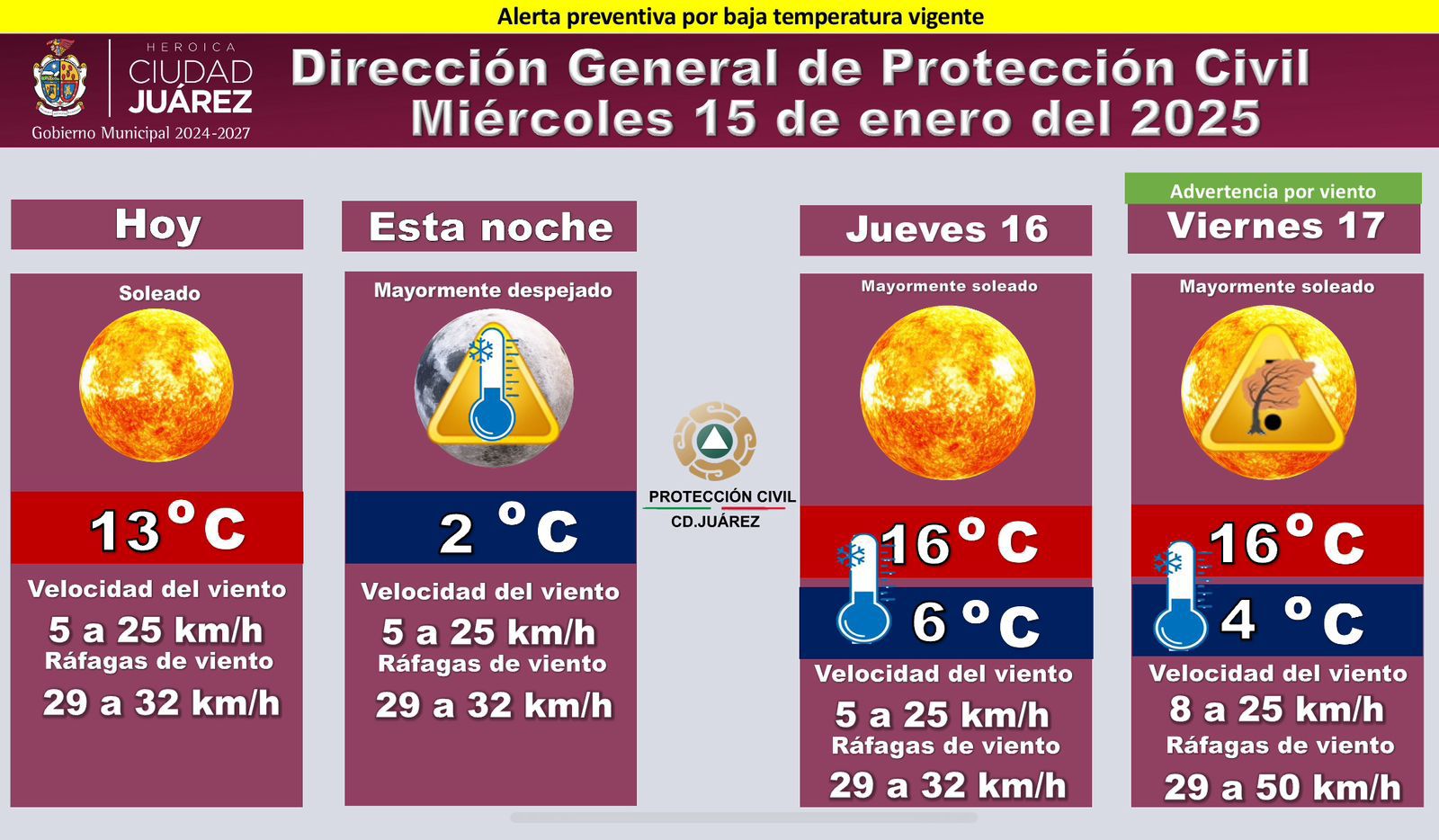 Juárez.- La Dirección General de Protección Civil informa sobre el pronóstico del clima para los días 15, 16 y 17 de enero de 2025, destacando una advertencia por vientos fuertes para el próximo viernes.