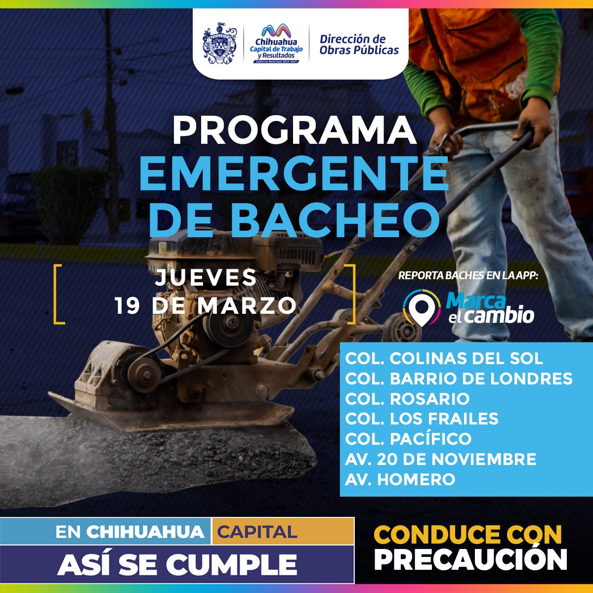 Chihuahua.- El Gobierno Municipal, a través de la Dirección de Obras Públicas, realizará trabajos de bacheo este jueves 19 de marzo mediante el programa emergente en las calles de las colonias: Colinas del Sol, Barrio de Londres, Rosario, Los Frailes y Pacífico, así como en las avenidas 20 de Noviembre y Homero.