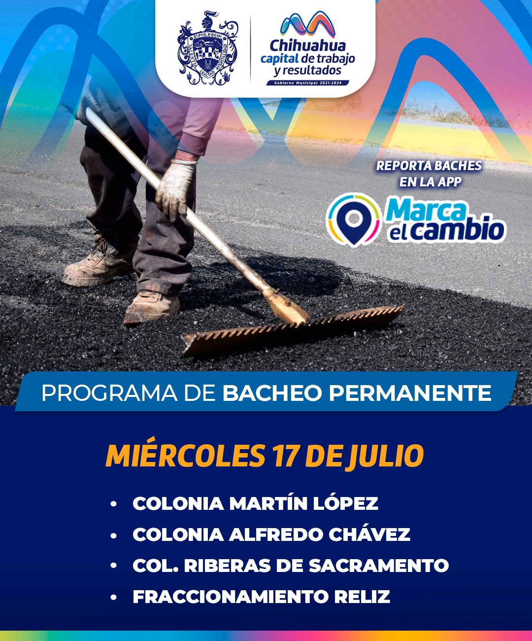 Chihuahua.- Con el objetivo de mejorar la superficie de rodamiento en la Capital, el Gobierno Municipal, a través de la Dirección de Obras Públicas, trabajará con bacheo este 17 de julio en calles de las colonias Martin López, Alfredo Chávez, Riberas del Sacramento y fraccionamiento Reliz.