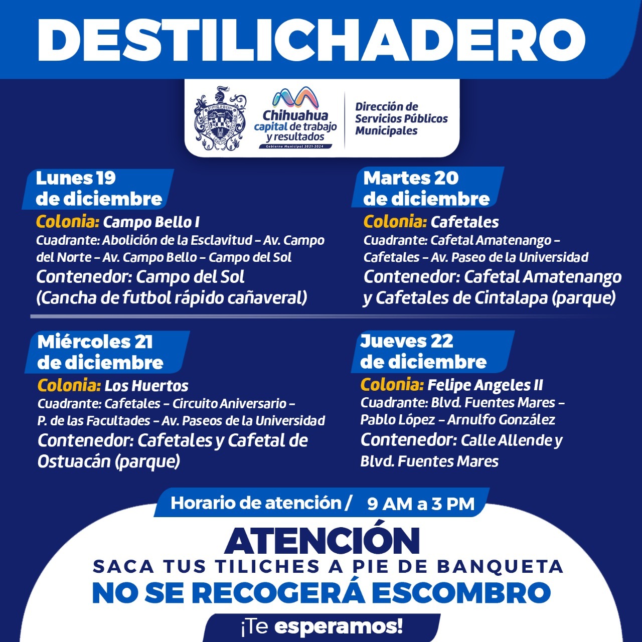 El Gobierno Municipal, a través de la Dirección de Servicios Públicos Municipales, informa a la ciudadanía el calendario del programa Destilichadero que se realizará del 19 al 22 de diciembre, el cual visitará cuatro colonias.