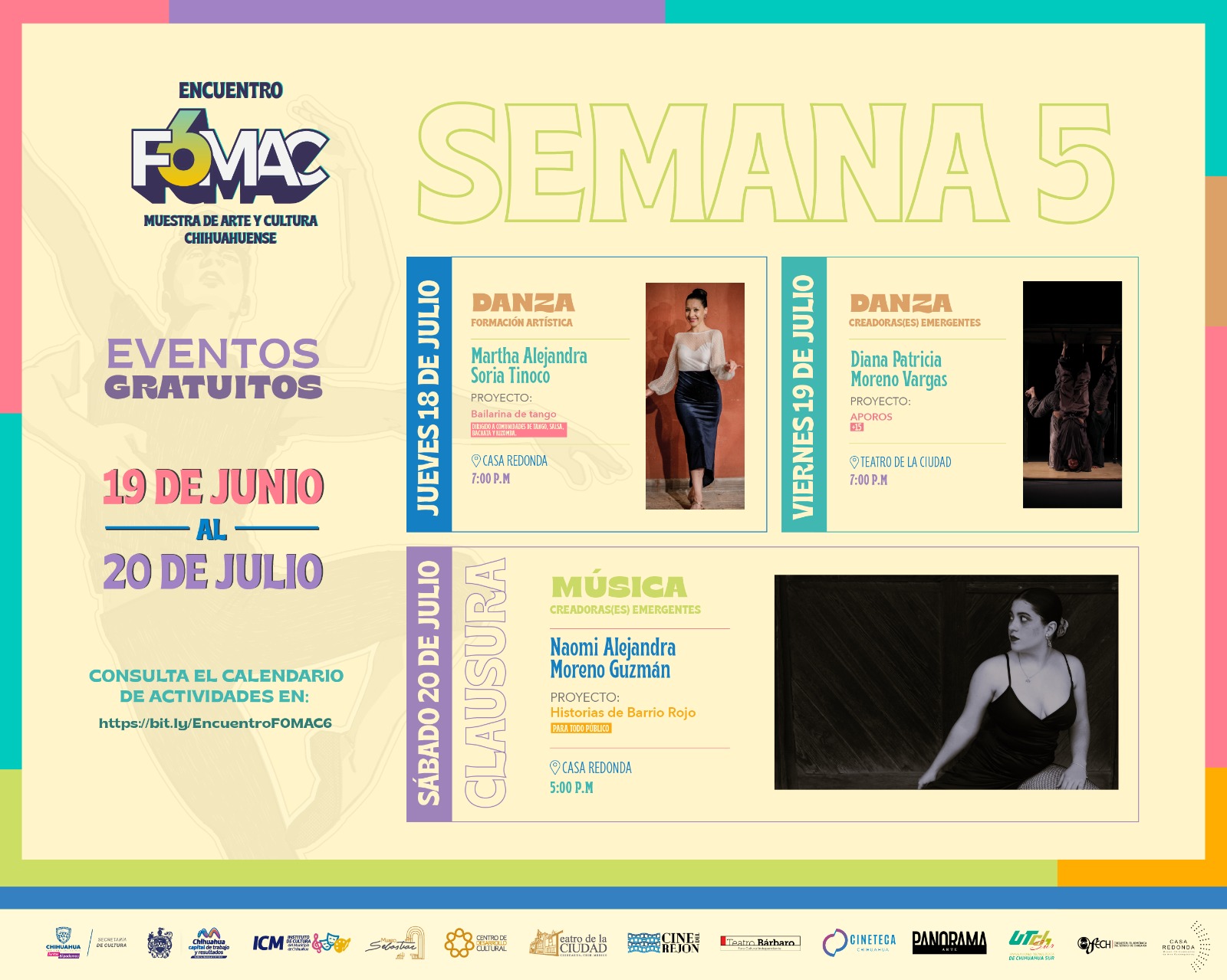 Para más información y detalles sobre el calendario completo de presentaciones, puedes ingresar a la siguiente liga: https://bit.ly/EncuentroFOMAC6 o visitar las redes sociales del Instituto de Cultura del Municipio.