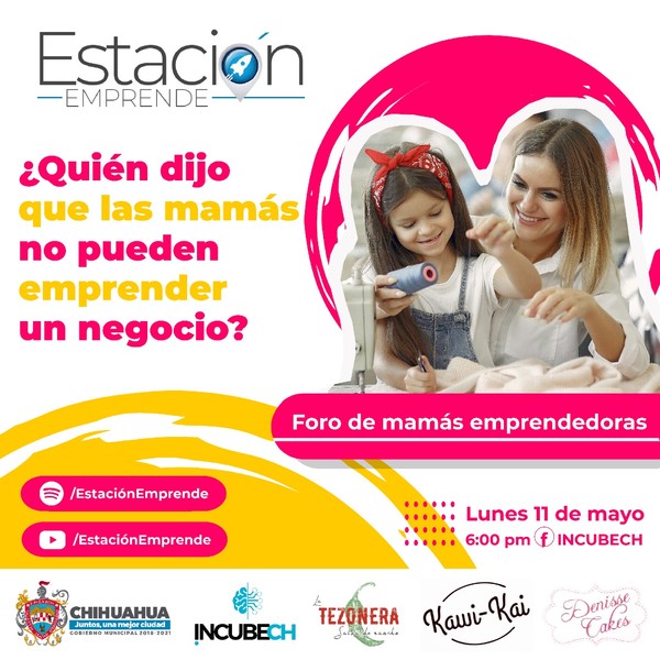 El Gobierno Municipal de Chihuahua, a través del programa Estación Emprende, invita al “Foro de mamás emprendedoras” que se transmitirá este lunes 11 de mayo a las 6 p.m., a través de la página de Facebook @Incubech.