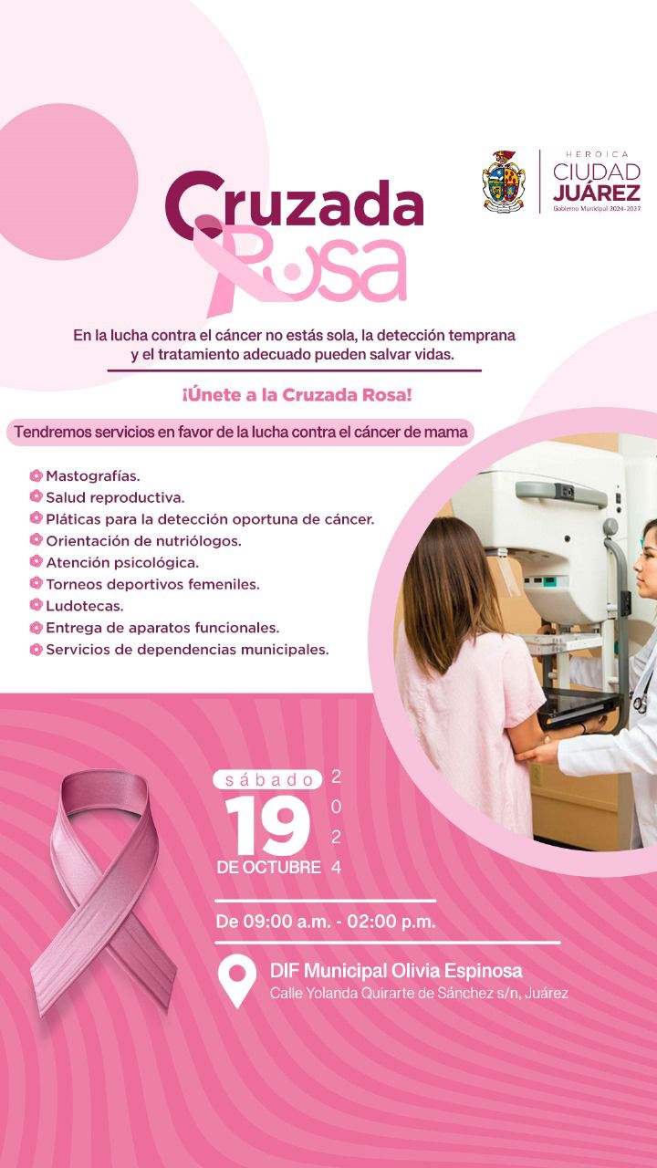 Juárez.- Todo está preparado para que mañana sábado a partir de las 9:00 de la mañana, las dependencias del Gobierno Municipal lleven diversos servicios a la comunidad, principalmente, aquellos enfocados en la lucha contra el cáncer de mama.