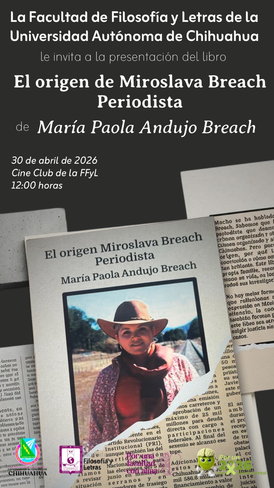 Chihuahua.- La Facultad de Filosofía y Letras de la Universidad Autónoma de Chihuahua invita a la comunidad universitaria y al público en general a la presentación del libro “El origen de Miroslava Breach, periodista”, de la autora María Paola Andujo Breach.