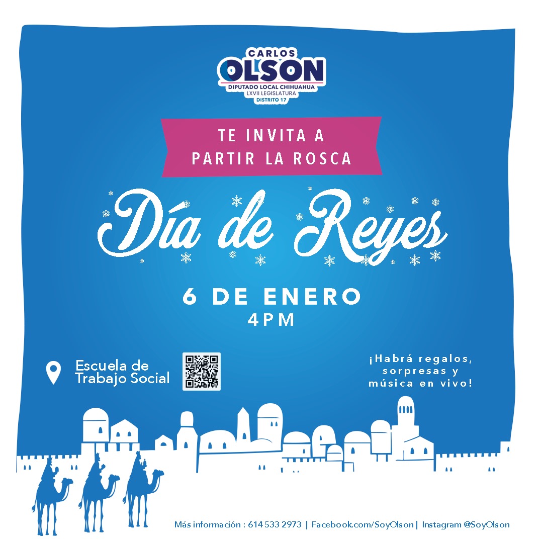 Chihuahua.- Con motivo del Día de Reyes, el diputado del PAN, Carlos Olson, invita a una celebración llena de diversión y tradición. El evento contará con una megarosca, así como la entrega de dulces y juguetes para todos los niños presentes.