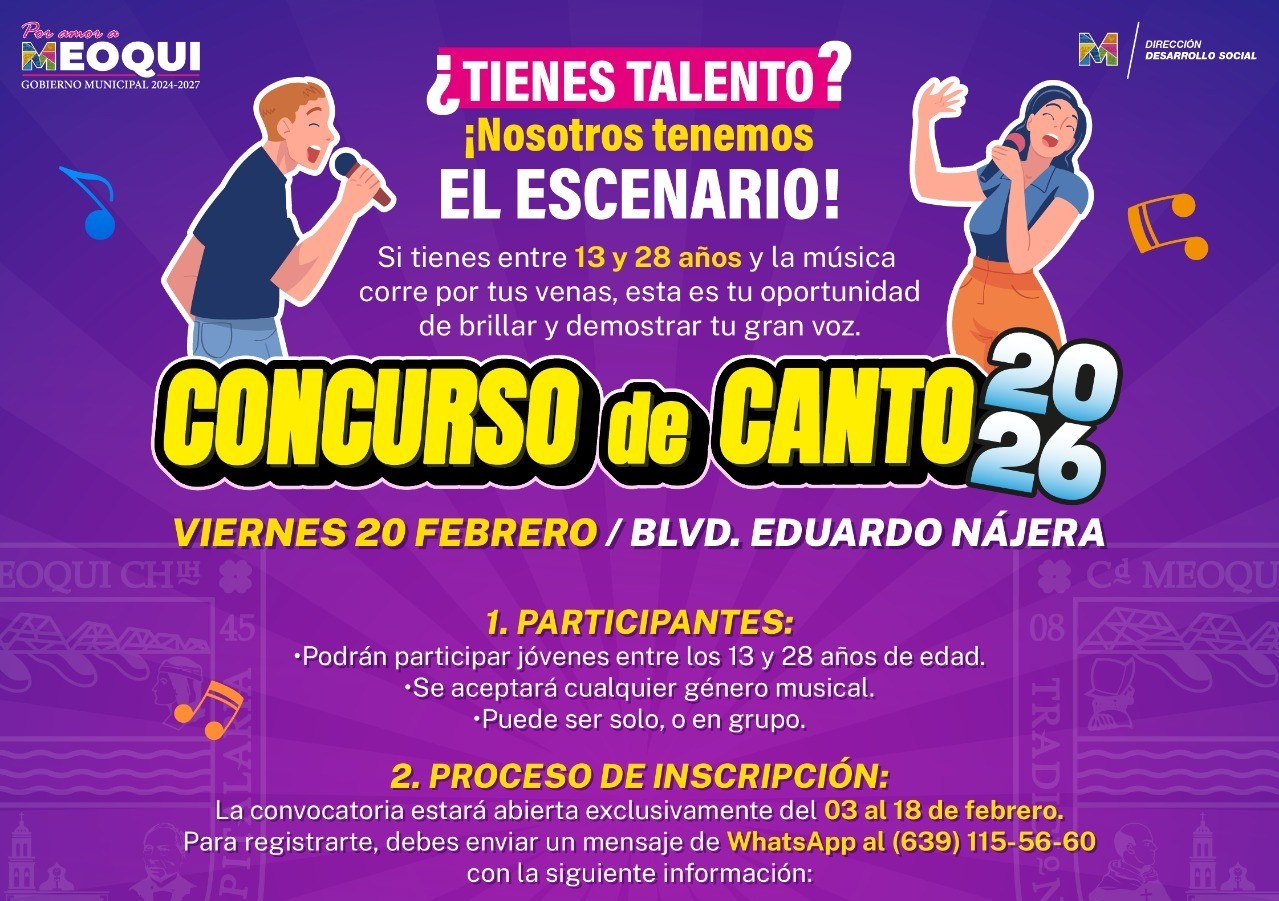 Meoqui.- El Gobierno Municipal, en coordinación con la Dirección de Desarrollo Social, Juventino de la Cruz Roja y el Instituto Municipal del Deporte y la Juventud, invita a jóvenes de 13 a 28 años de edad apasionados por el canto a registrarse en el Concurso de Canto del evento “Juventud en Acción 2026”, donde se premiará al primer lugar con mil pesos y al segundo lugar con 500 pesos. La fecha límite de inscripción es el viernes 18 de febrero, esto como encomienda de la alcaldesa Miriam Soto de abrir más espacios para promover el talento de los jóvenes meoquenses.