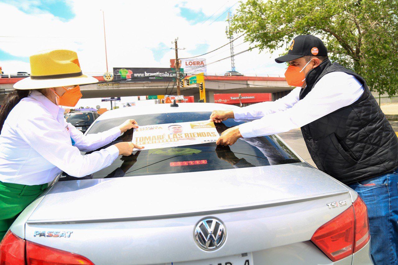 En su cuarto día de actividades en la frontera, El Caballo y su esposa Sol Sánchez de Lozoya, pegaron calcas en el crucero del Puente Al Revés, entre las avenidas Tecnológico y Gómez Morin.