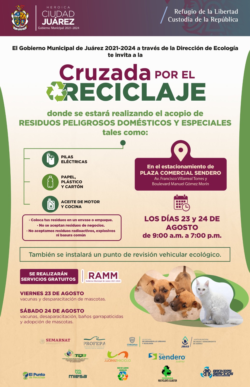 Juárez.- La Dirección de Ecología llevará a cabo mañana y el sábado la Cruzada por el Reciclaje en la Plaza Comercial Sendero, ubicada entre Manuel Gómez Morín y Valle del Sol.