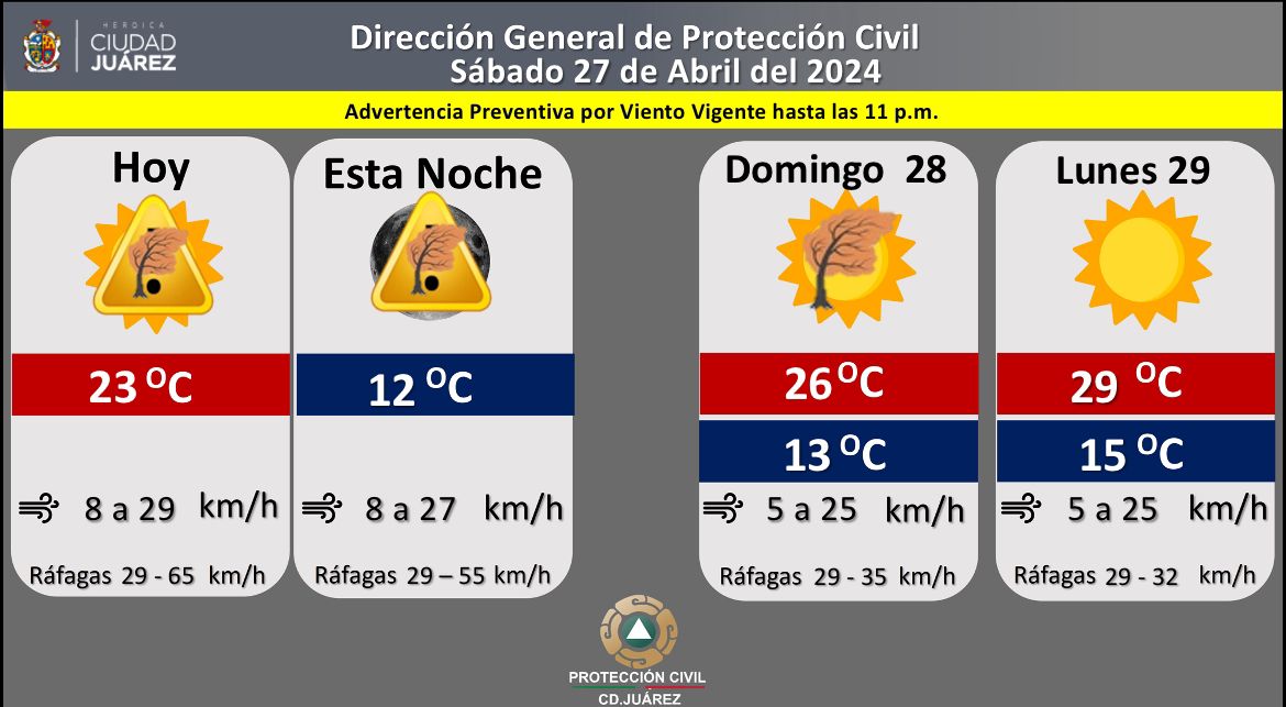 Ciudad Juárez, Chih.- La Dirección General de Protección Civil informó que para este sábado 27 de abril continuarán registrándose ráfagas de viento hasta de 65 kilómetros por hora.