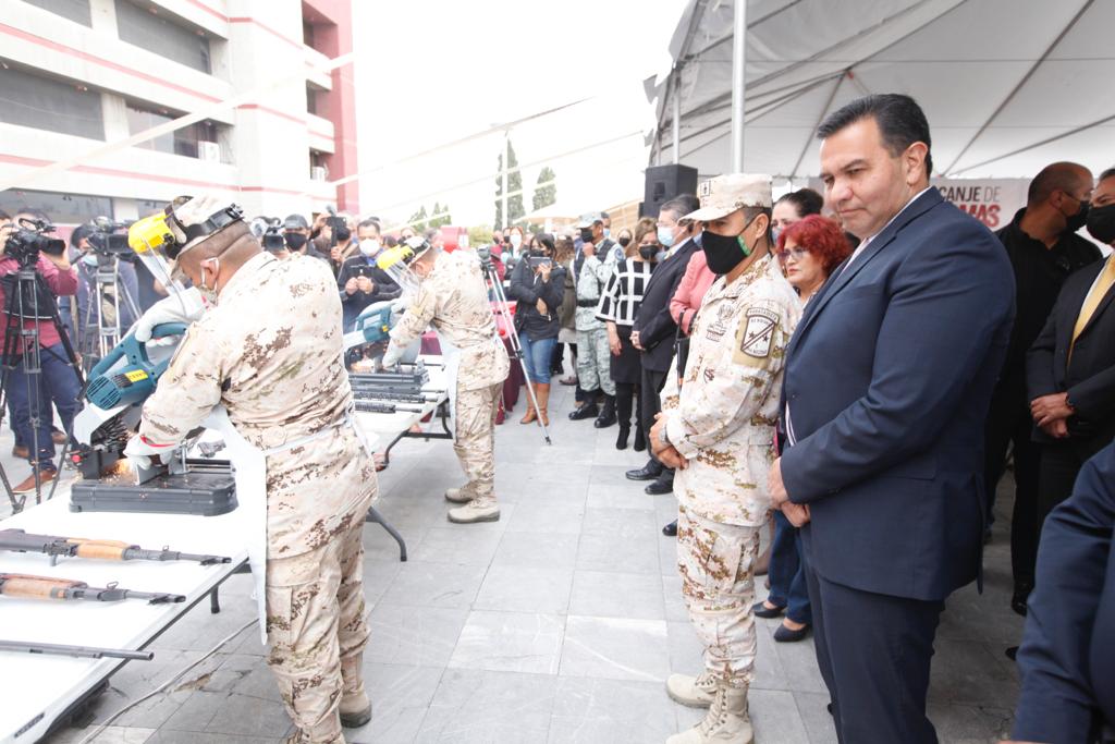 Juárez.- En beneficio de la seguridad juarense, el Presidente Municipal, Cruz Pérez Cuéllar, dio arranque a la campaña de Canje de Armas de Fuego 2021, con el propósito de que la ciudadanía entregue voluntariamente las armas que puedan tener guardadas en sus domicilios.