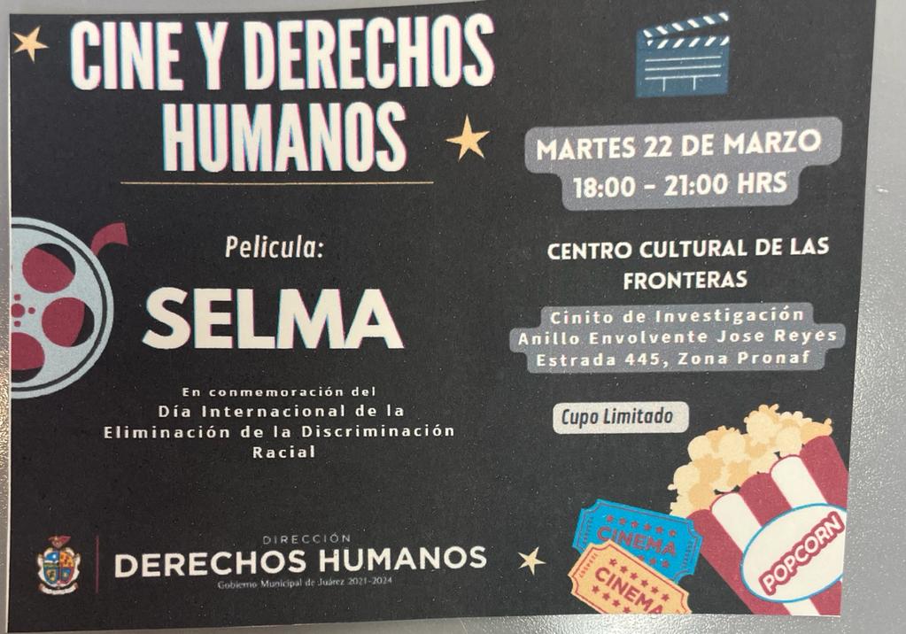 Juárez.- La Dirección de Derechos Humanos proyectará este martes la película “Selma”, en conmemoración del Día Internacional de la Eliminación de la Discriminación Racial, la cual será exhibida en el Centro Cultural de las Fronteras, dio a conocer Santiago González Reyes, titular de la dependencia.