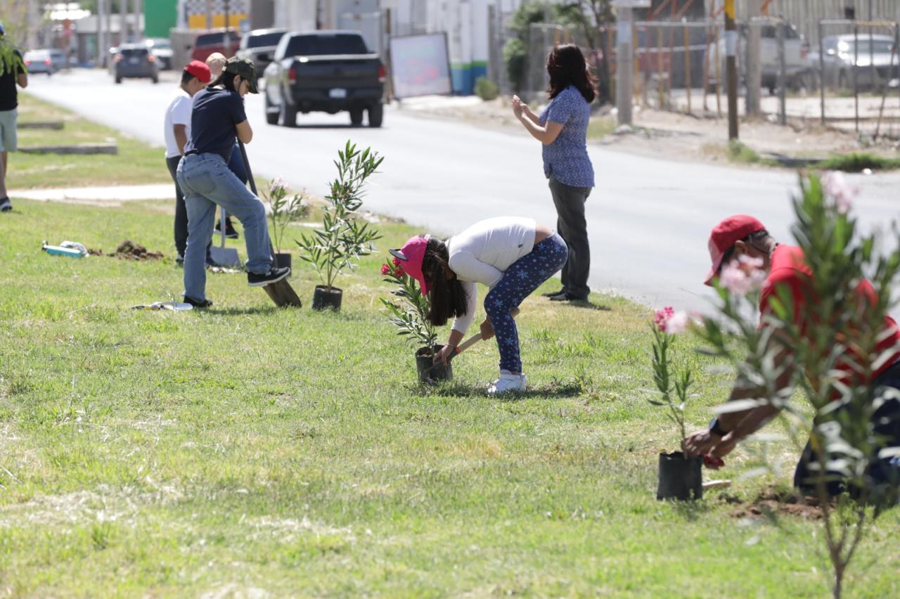 Ciudad Juárez.- Ciudadanos de todas las edades se unieron este sábado a la jornada de forestación del parque lineal IV Siglos, organizada por la Dirección de Parques y Jardines.