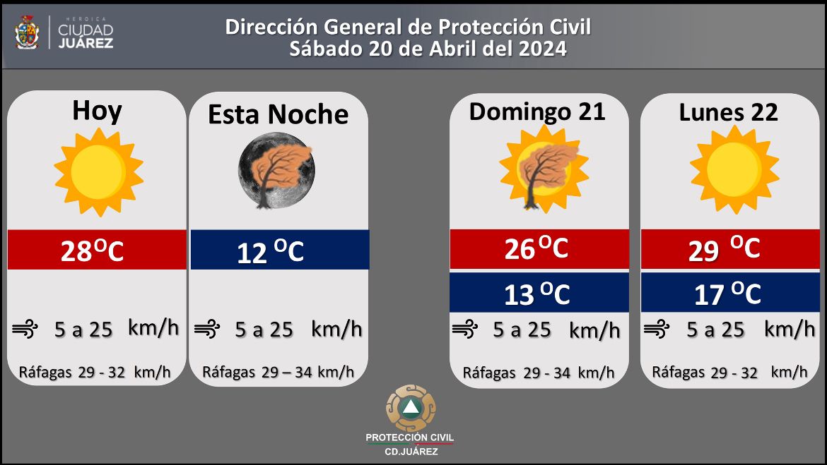 Ciudad Juárez.- La Dirección General de Protección Civil, con base en informes del Servicio Meteorológico Nacional, pronostica un sábado mayormente soleado con una temperatura máxima de 28 grados Celsius, mientras que la mínima será de 12 °C para esta noche.