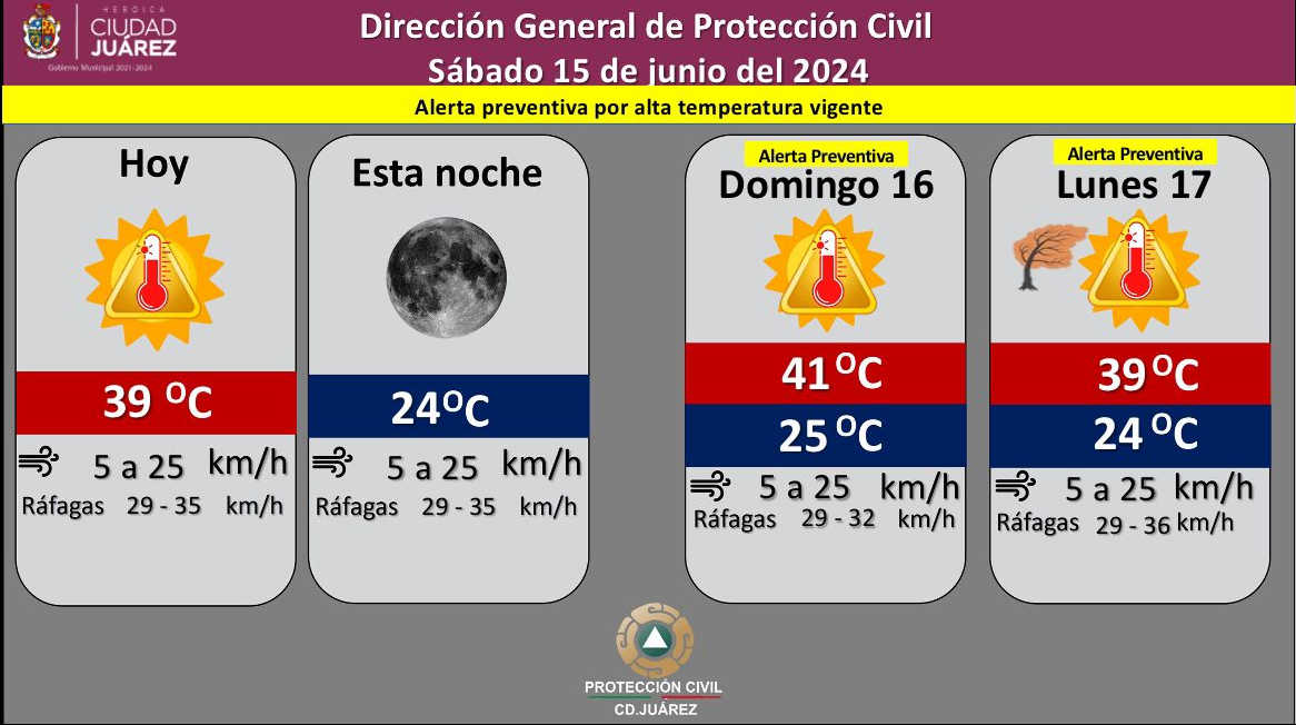 Ciudad Juárez, Chih.- La Dirección General de Protección Civil, con base en informes del Servicio Meteorológico Nacional, pronostica un sábado soleado con una temperatura máxima de 39 grados Celsius, mientras que la mínima será de 24 °C para esta noche.