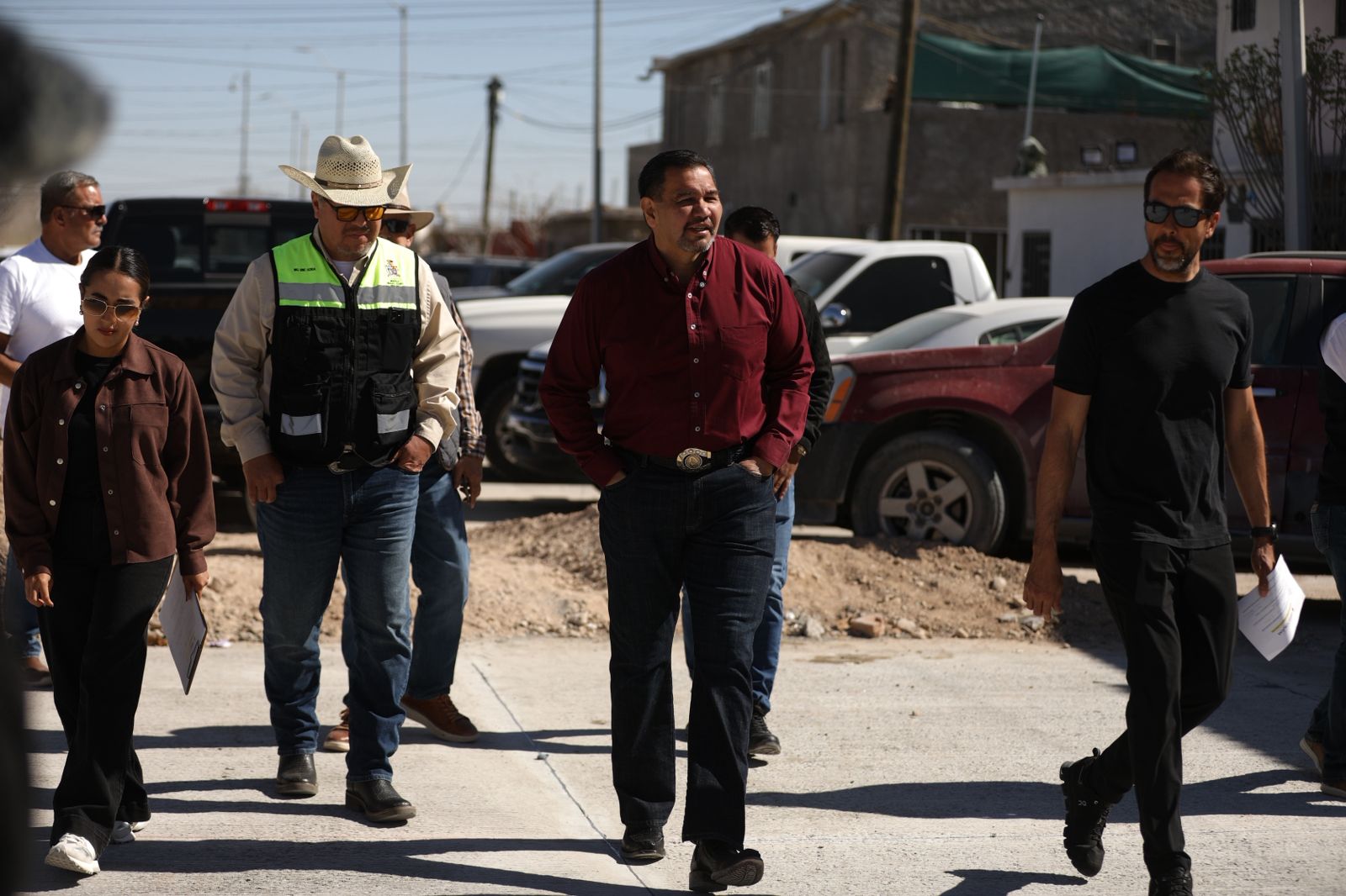 Durante la visita, el alcalde verificó las labores que se realizan en el tramo que se interviene de la vialidad hacia la calle María Teresa Rojas, donde actualmente se llevan a cabo trabajos de construcción de banquetas y losas como parte del proyecto de mejoramiento de la infraestructura urbana.