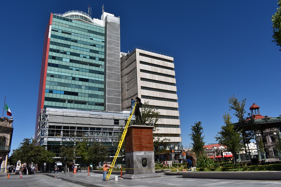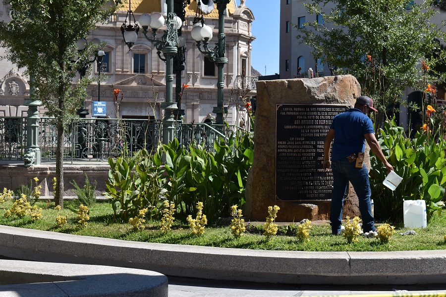La icónica estatua del gobernador y comandante de la Provincia de la Nueva Vizcaya, Don Antonio de Deza y Ulloa, fue limpiada y abrillantada, además se engalanaron los jardines que flanquean el kiosco de la plaza.
