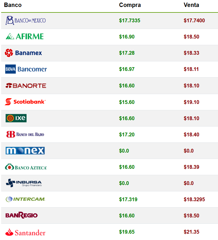 El tipo de cambio interbancario promedio se encuentra en $17.4683 a la compra y $18.0143 a la venta, en el Banco de México $17.7335 a la compra y $17.7400 a la venta, en el Diario Oficial de la Federación (DOF) se publicó en $17.778 y es el valor que toma como referencia el Servicio de Administración Tributaria (SAT), mientras que el Pago para Obligaciones Fiscales en dólares es de $17.8998 por unidad.