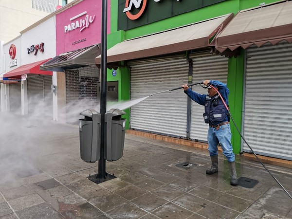 Con agua a presión, jabón y cloro, personal de la Subdirección de Espacios Públicos se encargan de a diario brindar limpieza a la Plaza de Armas, así como a las entradas de la misma; desde la avenida independencia a la calle Aldama, así como de la Independencia a la Juárez, además de la calle Cuarta a la Independencia.