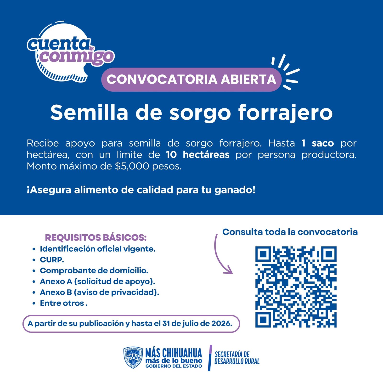 Chihuahua.- Con el objetivo de fortalecer la producción pecuaria y agrícola en el estado, la Secretaría de Desarrollo Rural (SDR), informó que ya se encuentra disponible la convocatoria para acceder al apoyo de semilla de sorgo forrajero, como parte del programa Cuenta Conmigo en el Campo.