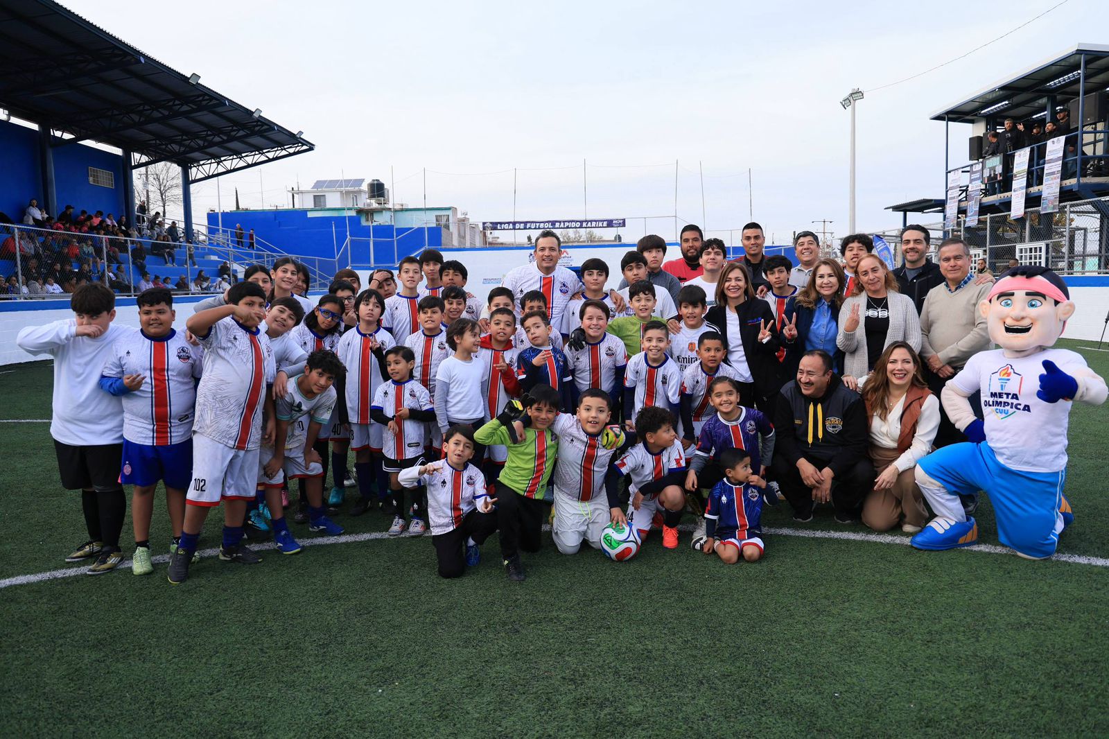 Chihuahua.-El alcalde Marco Bonilla inauguró la rehabilitación del parque Lomas Karike, donde convivió con vecinas y vecinos y jugó un partido de futbol con niñas y niños del sector, como parte de la entrega de este espacio público renovado gracias al Presupuesto Participativo.
