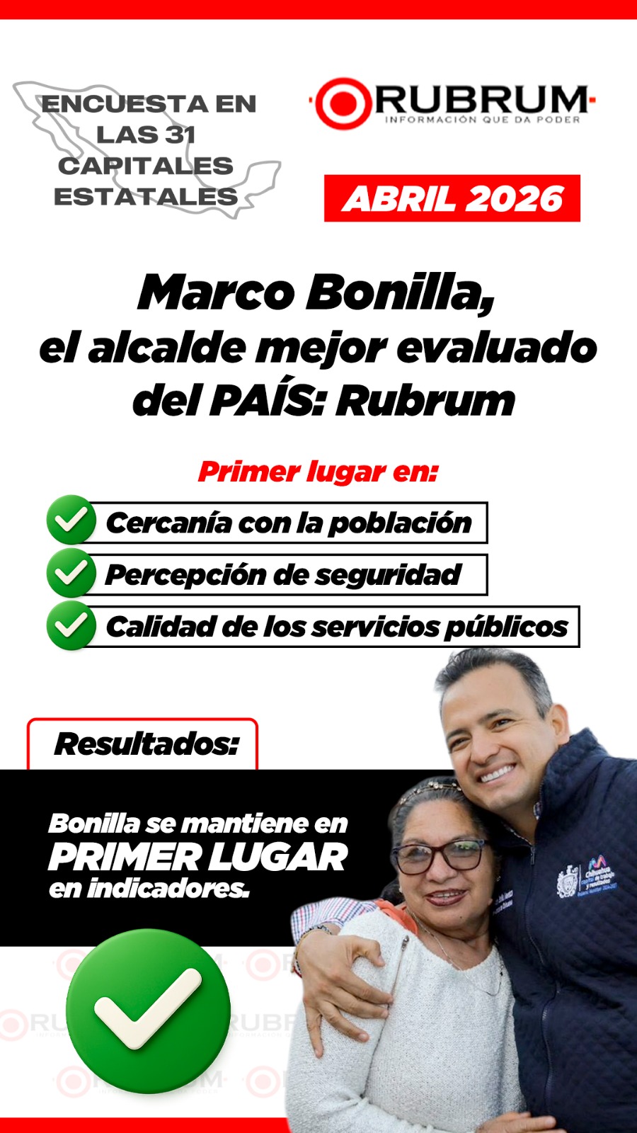Nacional.- El alcalde Marco Bonilla posicionó a Chihuahua Capital en el primer lugar nacional en percepción de seguridad, servicios públicos y desempeño de gobierno, de acuerdo con la encuesta RUBRUM correspondiente a abril de 2026.