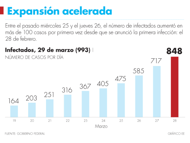 Para este domingo, según comunicaron las autoridades de salud, la cifra de casos confirmados ascendió a 993 y 2,564 sospechosos, lo que equivale a un aumento de 170% en los infectados y de 210% en los casos que se mantienen bajo vigilancia como sospechosos, en comparación con el lunes 23 de marzo.
