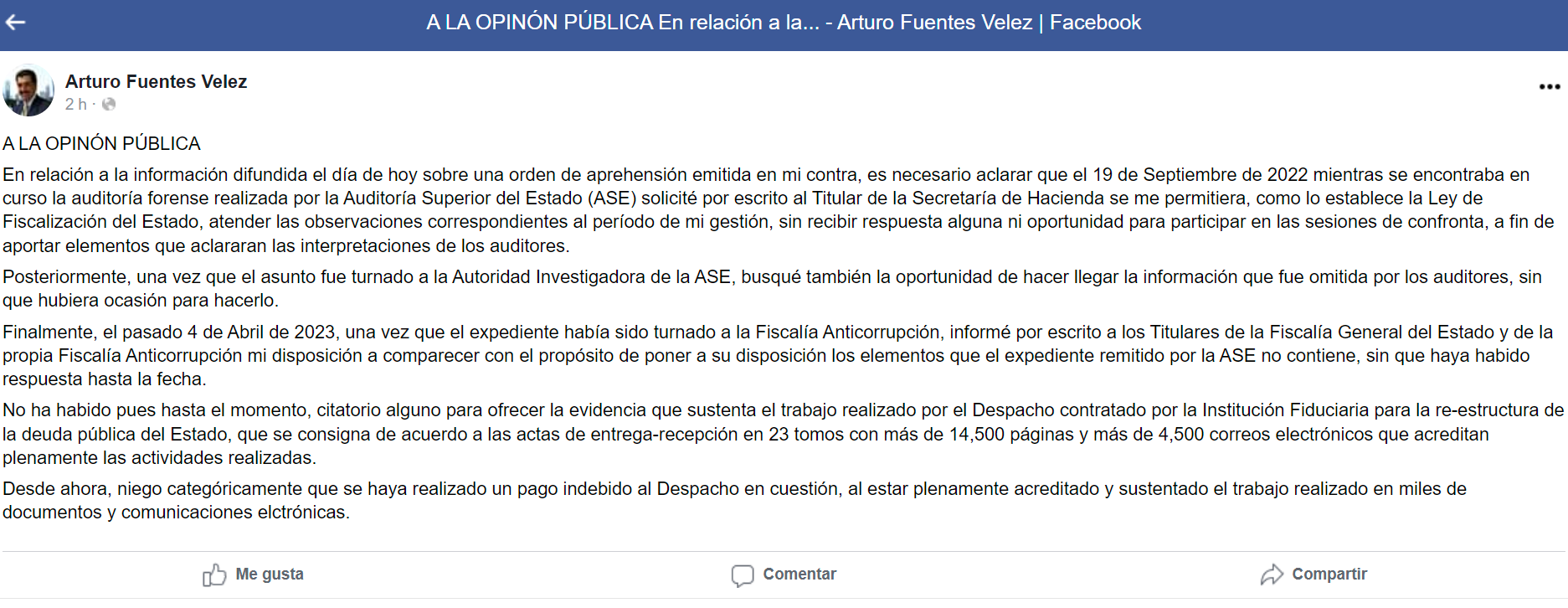 Chihuahua.- El extitular de la Secretaría de Hacienda en el gobierno de Javier Corral, Arturo Fuentes Vélez emitió un comunicado en relación a una orden de aprehensión en su contra por presunta corrupción durante su gestión y negó categóricamente cualquier pago indebido a un despacho que se encargó de la reestructuración de la deuda pública del Estado.