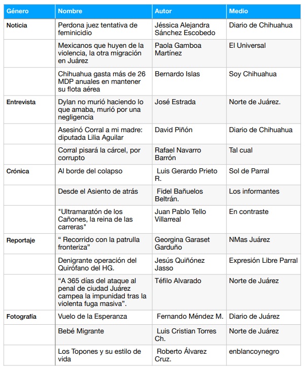 El Presidente del Foro de Periodistas de Chihuahua, Nicolás Juárez, dio a conocer hoy a los nominados del Premio Estatal del Periodismo ” José Vasconcelos”, evento en el que se galardonará el trabajo de los mejores periodistas y comunicadores en las categorías de Noticia, Entrevista, Reportaje, Crónica y Fotografía.
