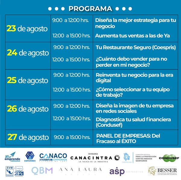Para conocer el programa completo, se invita a la población a visitar las páginas de Facebook de INCUBECH y Red Emprende Chihuahua, o llamar al 200-48-00 extensión 2957 de lunes a viernes en un horario de 9:00 a 15:00 horas.