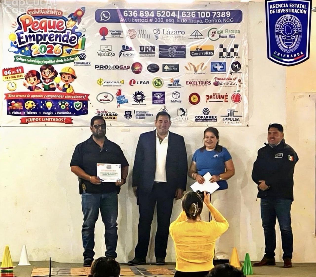Nuevo Casas Grandes.- Elementos de la Agencia Estatal de Investigación del Grupo de Orientación Escolar Chihuahuense de la Fiscalía de Distrito Zona Noroeste, participaron en la clausura del campamento de verano denominado “Peque Emprende 2026”, organizado por la Confederación Patronal de la República Mexicana (COPARMEX).
