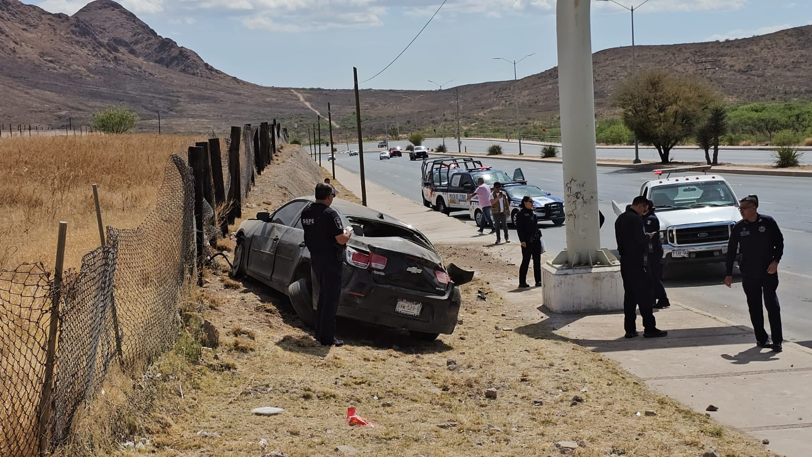 Chihuahua, Chih.- Un aparatoso accidente se registró en el cruce del periférico R. Almada y la calle Valle Dorado, donde un vehículo terminó volcado tras perder el control.