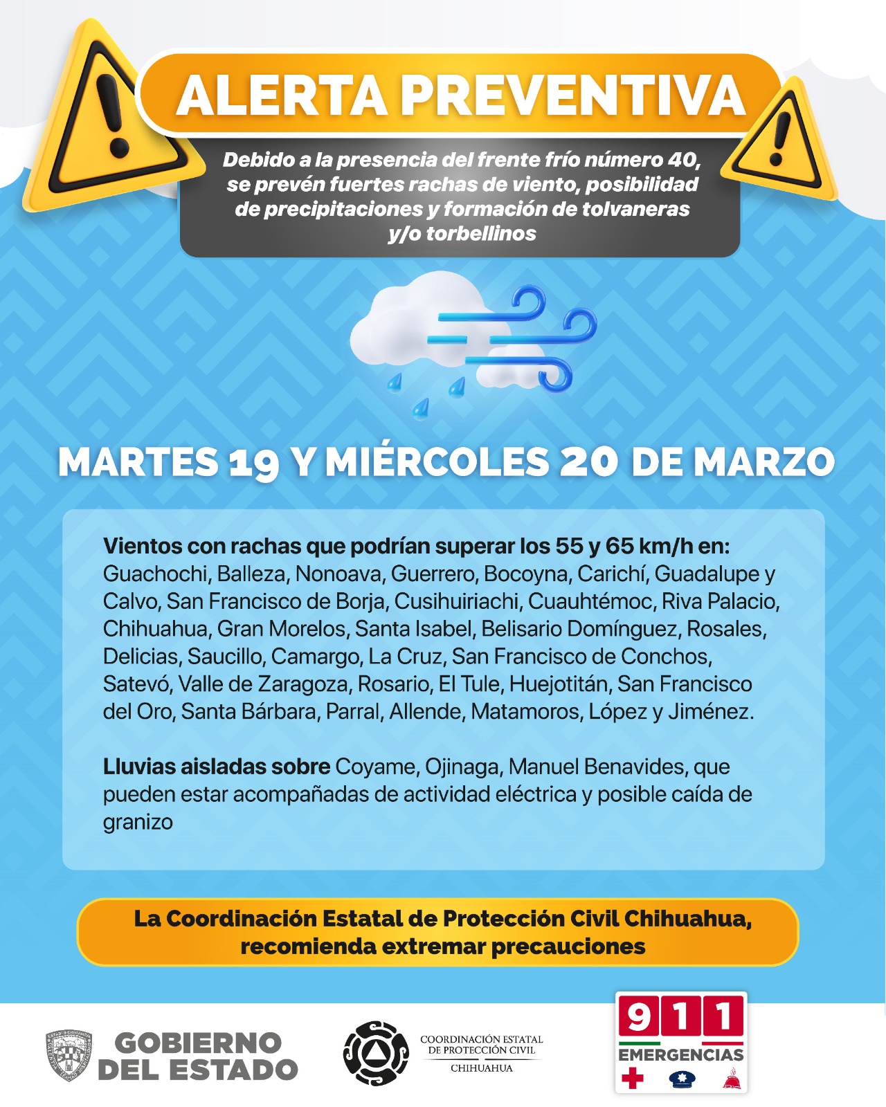 Durante esta tarde se esperan vientos fuertes con ráfagas que podrían superar los 55 kilómetros por hora (km/h) en Balleza, Nonoava, Chihuahua, Rosales, Delicias, Saucillo, La Cruz, San Francisco de Conchos, Parral y Allende.