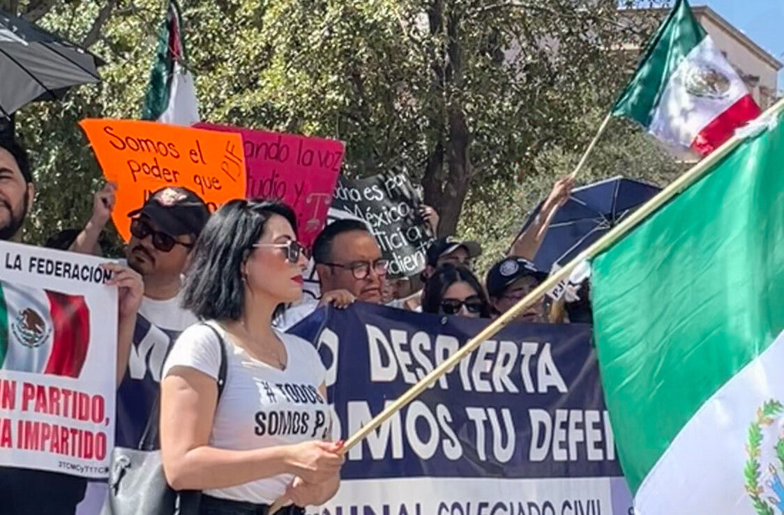 Con pancartas y cantos, los asistentes se negaron a que se apruebe la reforma, toda vez que aseguran es una amenaza para la justicia en Chihuahua, contrario a lo que se ha mencionado desde el Gobierno Federal, desde donde se insiste en que su finalidad es fortalecer la soberanía judicial.