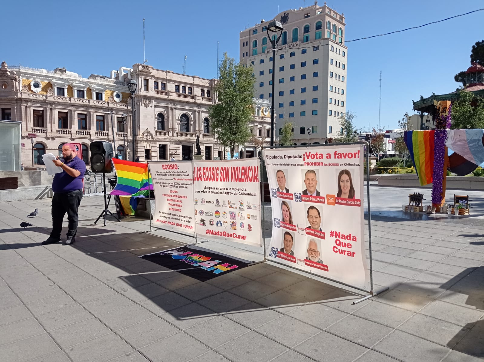 Con una lona con los rostros de varios legisladores, a quienes pidieron votar a favor dicha modificación a la ley, que permitirá castigar hasta con 8 años de cárcel a quien someta a una persona a quien someta a una persona a “terapias de conversión” de orientación sexual e identidad de género.