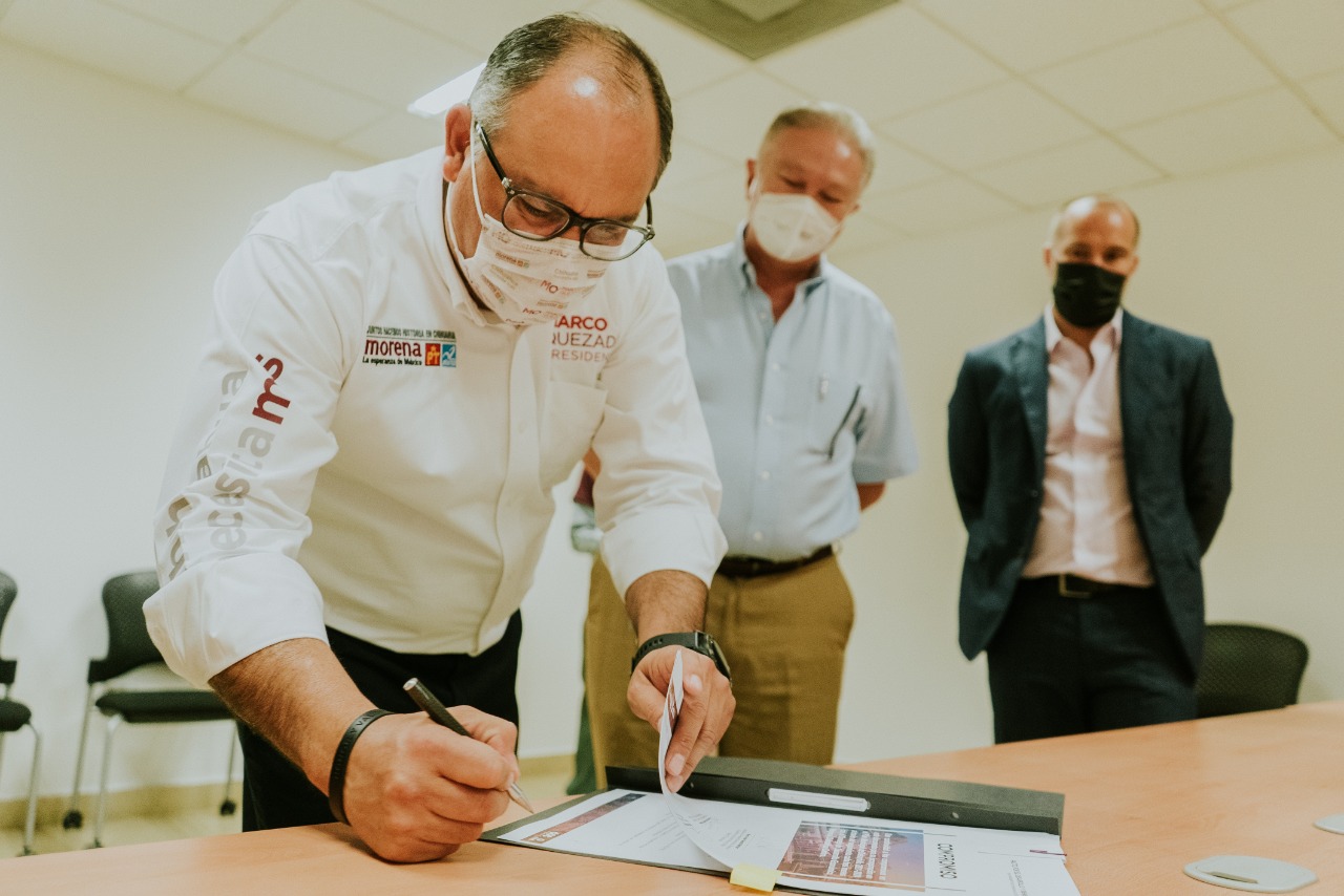 Chihuahua.- Es preciso que tanto el sector público como el sector privado caminen de la mano en la búsqueda de un proyecto de desarrollo económico, donde se engarcen las ideas y los esfuerzos de todos para darle a Chihuahua un mejor nivel de vida, aseguró el candidato a la alcaldía Marco Quezada, durante la firma del compromiso para incorporar las propuestas del empresariado chihuahuense al Plan Municipal de Desarrollo 2021-2024.