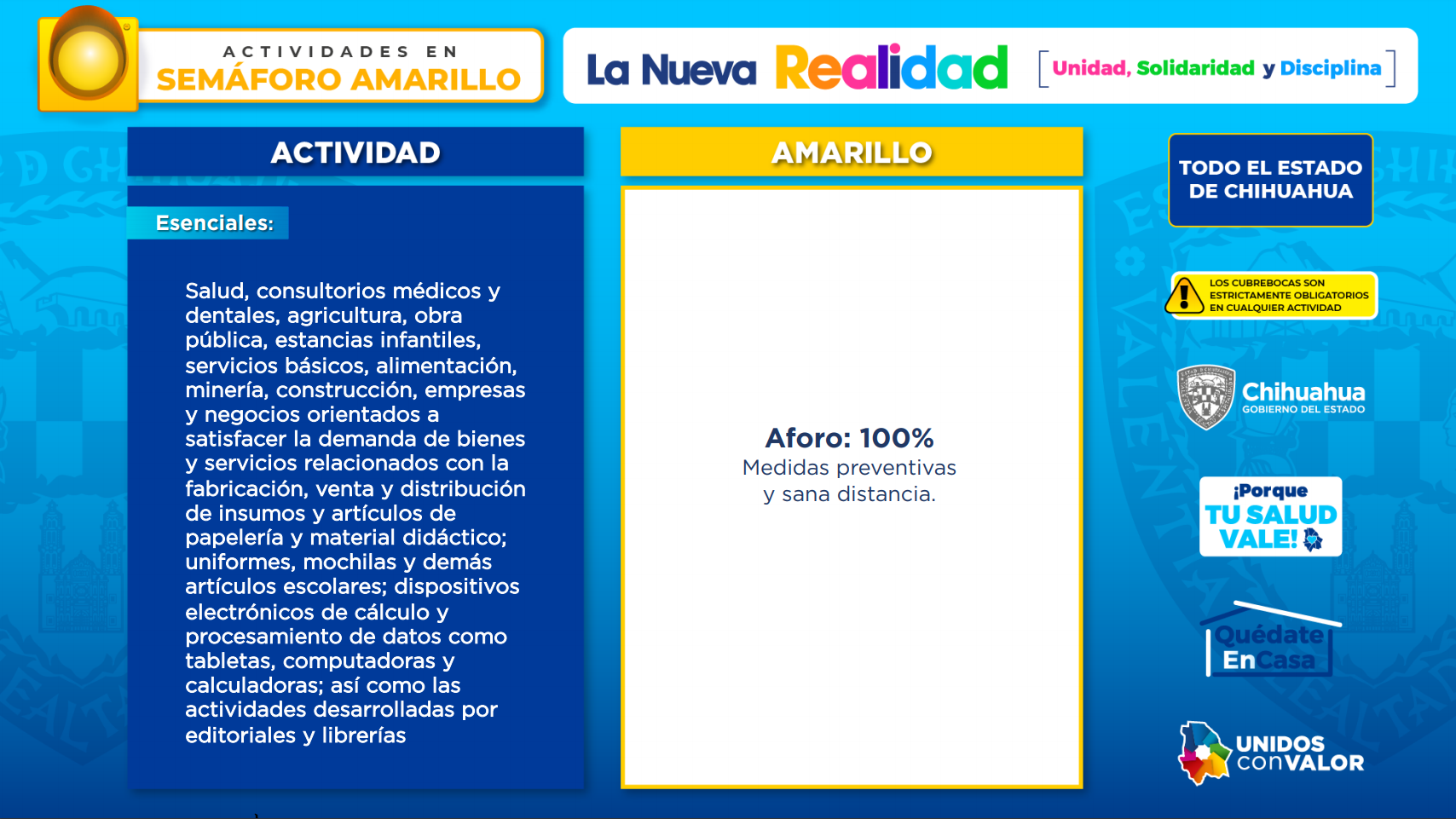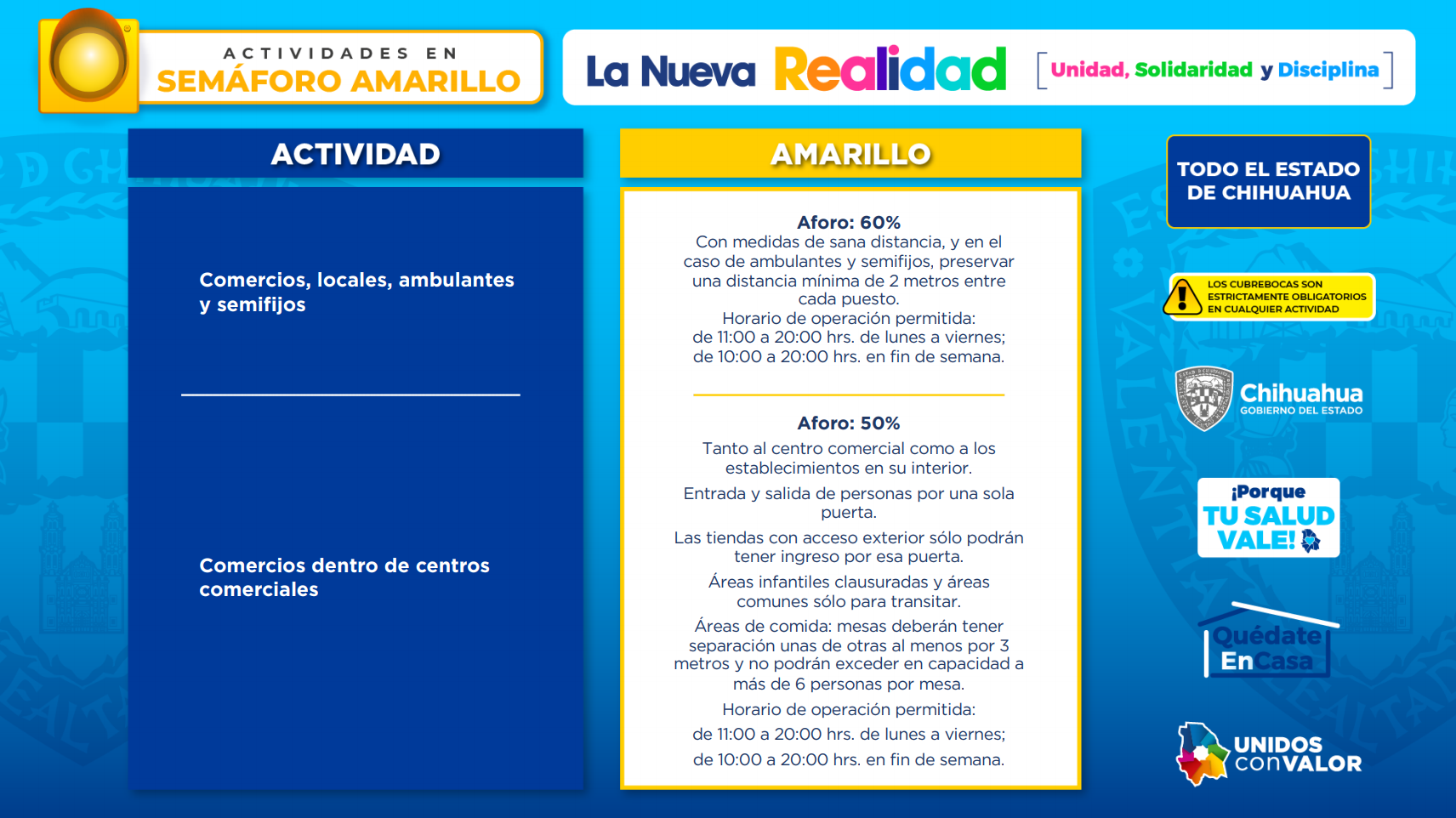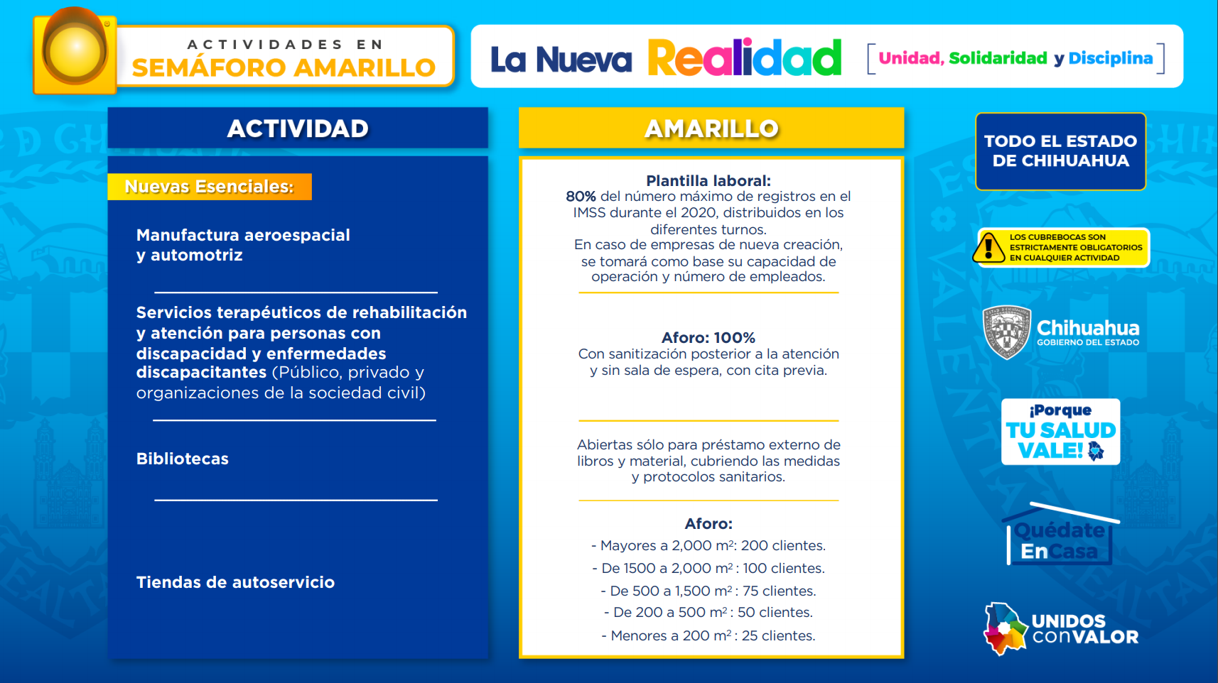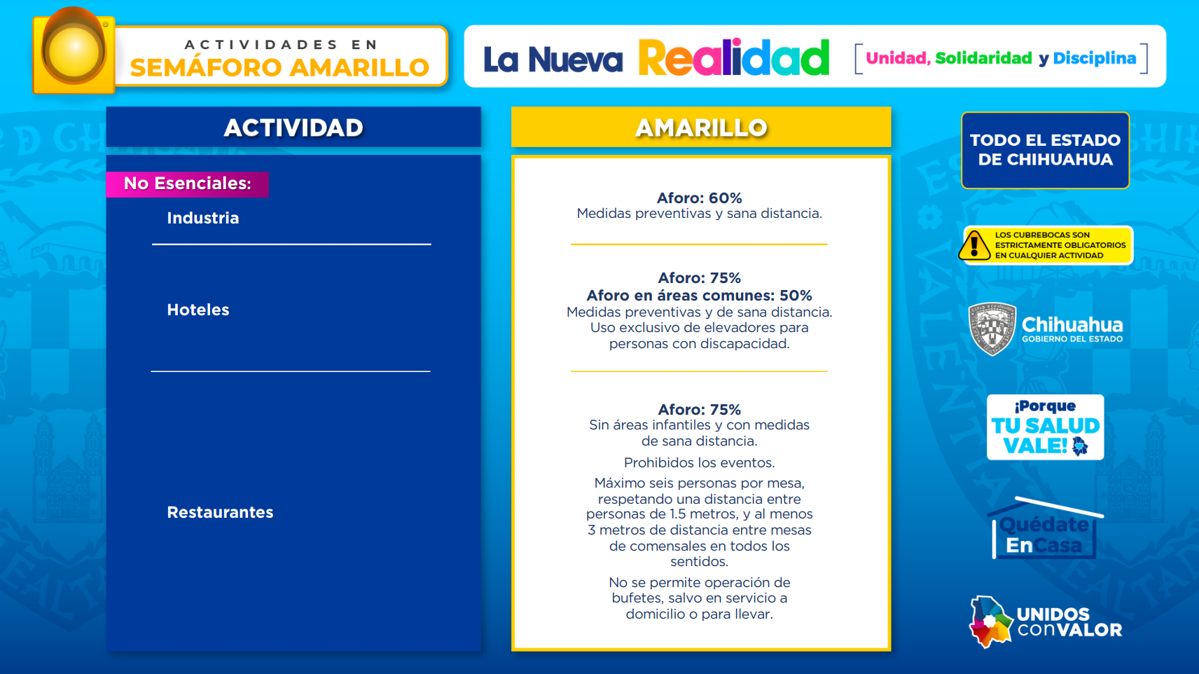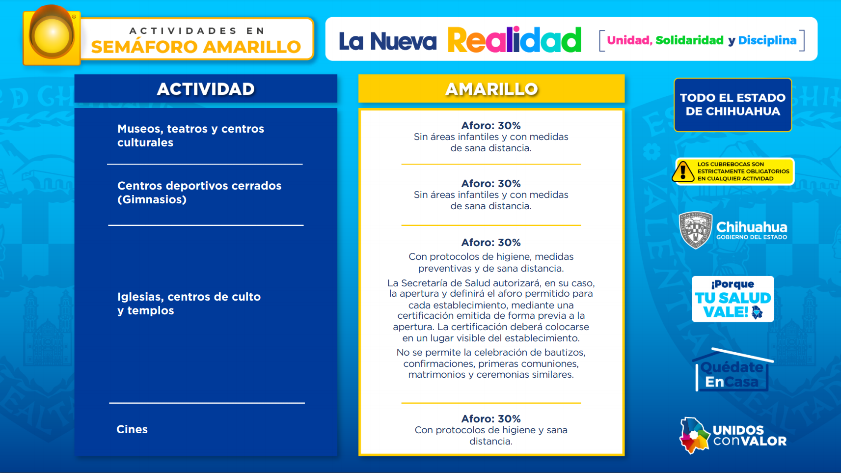 Como fue informado anteriormente por la Secretaría de Salud, este lunes 28 de septiembre iniciará para Chihuahua el semáforo amarillo, así como los estados de Baja California, Sonora, Coahuila, Tamaulipas, Sinaloa, Durango, Aguascalientes, Guanajuato, Querétaro, Puebla, Morelos, Tlaxacala, Oaxaca, Tabasco y Chiapas.
