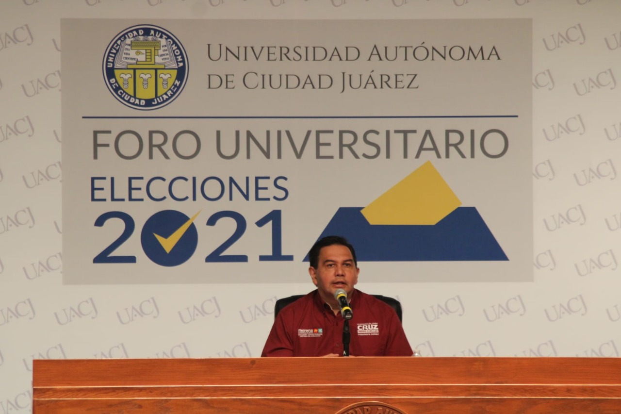 Juárez.- Cruz Pérez Cuéllar, candidato de Morena en la Coalición Juntos Haremos Historia en Chihuahua, participó en el Foro Universitario Elecciones 2021, ejercicio que incluyó una ronda de preguntas por parte de la comunidad universitaria. y que se transmitió por redes sociales.