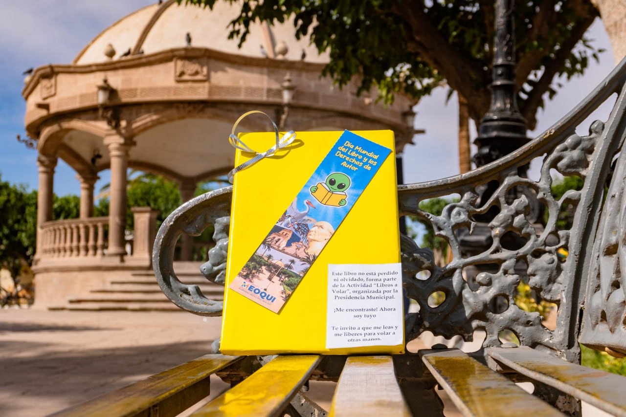 Meoqui.- En el marco del Día Internacional del Libro, el Gobierno Municipal de Meoqui, a través de la Dirección de Desarrollo Social, llevará a cabo este jueves 23 de abril la actividad “Libros a Volar”, mediante la cual se pondrán en circulación más de 300 libros que serán escondidos en distintos puntos de la cabecera municipal, así como en planteles educativos y podrán encontrar y conservar de manera gratuita.