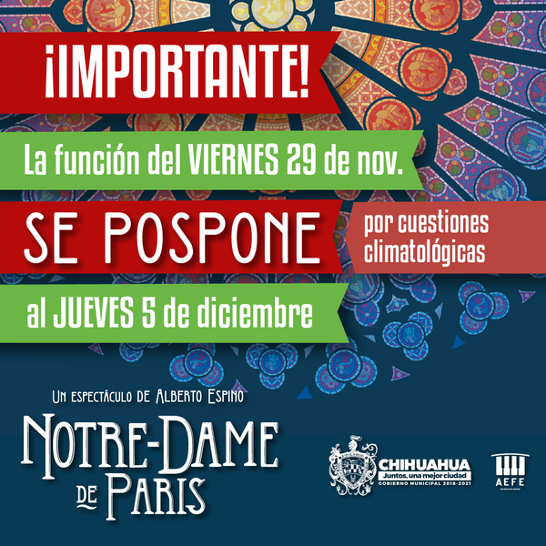 El Gobierno Municipal informa a toda la comunidad que debido al pronóstico del tiempo, el cual señala que el próximo viernes 29 de diciembre se presentarán fuertes ráfagas de viento en la ciudad de Chihuahua, y para salvaguardar la seguridad de los asistentes y actores, la función del espectáculo “Notre Dame de París” programada para este viernes 29 de noviembre será reprogramada para el jueves 5 de diciembre, en el mismo horario y lugar.