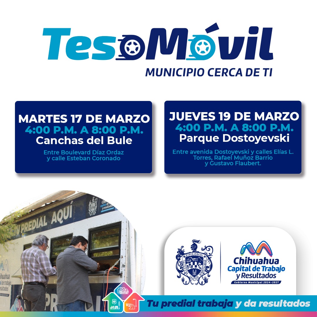 Chihuahua.- El Gobierno Municipal informa a la ciudadanía que este martes 17 y jueves 19 de marzo acercarán los servicios de la Tesorería a través del Teso Móvil de 16:00 a 20:00 horas.