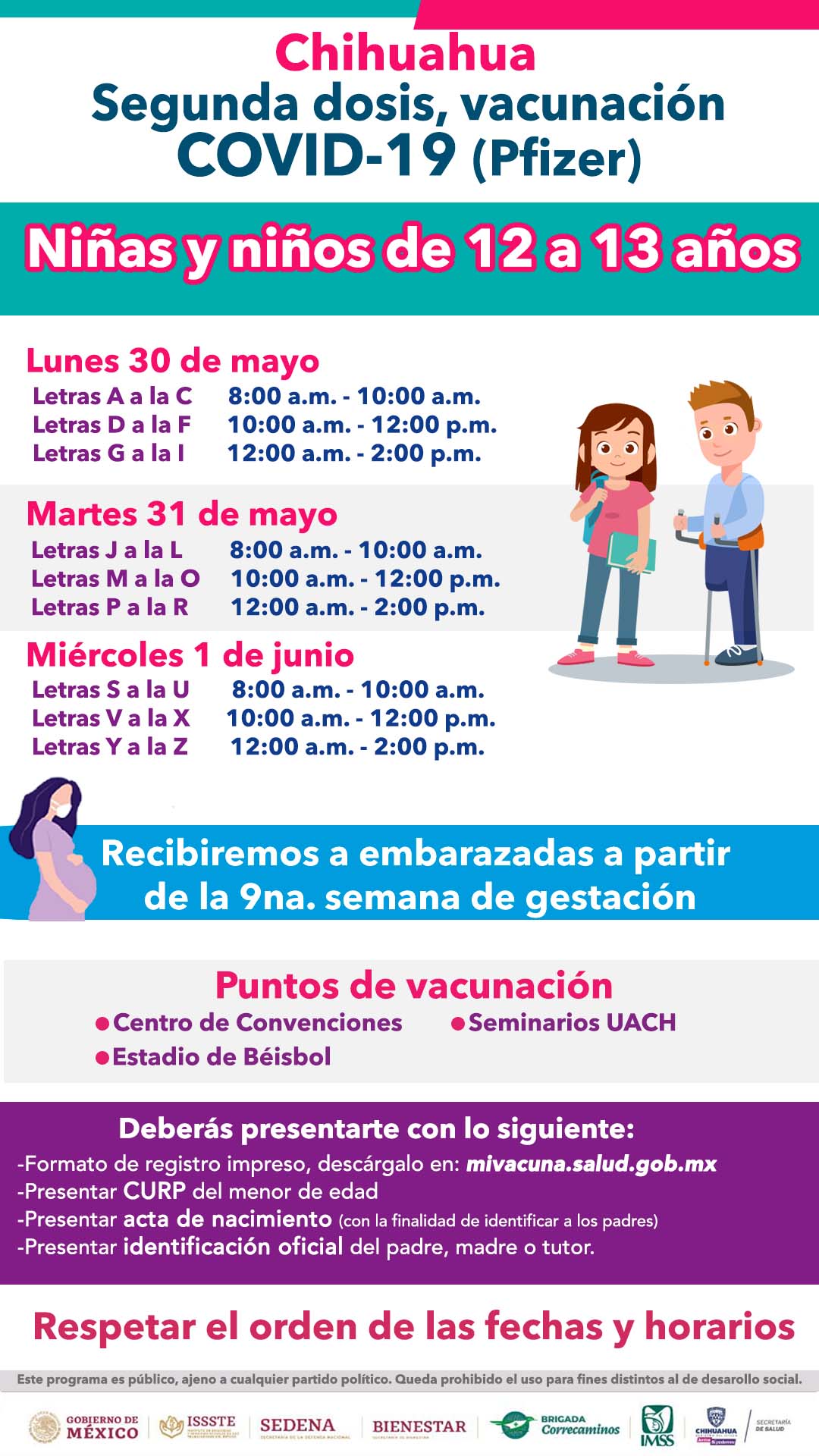 Chihuahua.- La Secretaría de Salud en coordinación con las instituciones a cargo de la vacunación contra COVID-19, informa que del 30 de mayo al 1 de junio inició la aplicación de la segunda dosis de la vacuna de Pfizer a menores de 12 a 13 años de edad, que residen en la ciudad de Chihuahua.