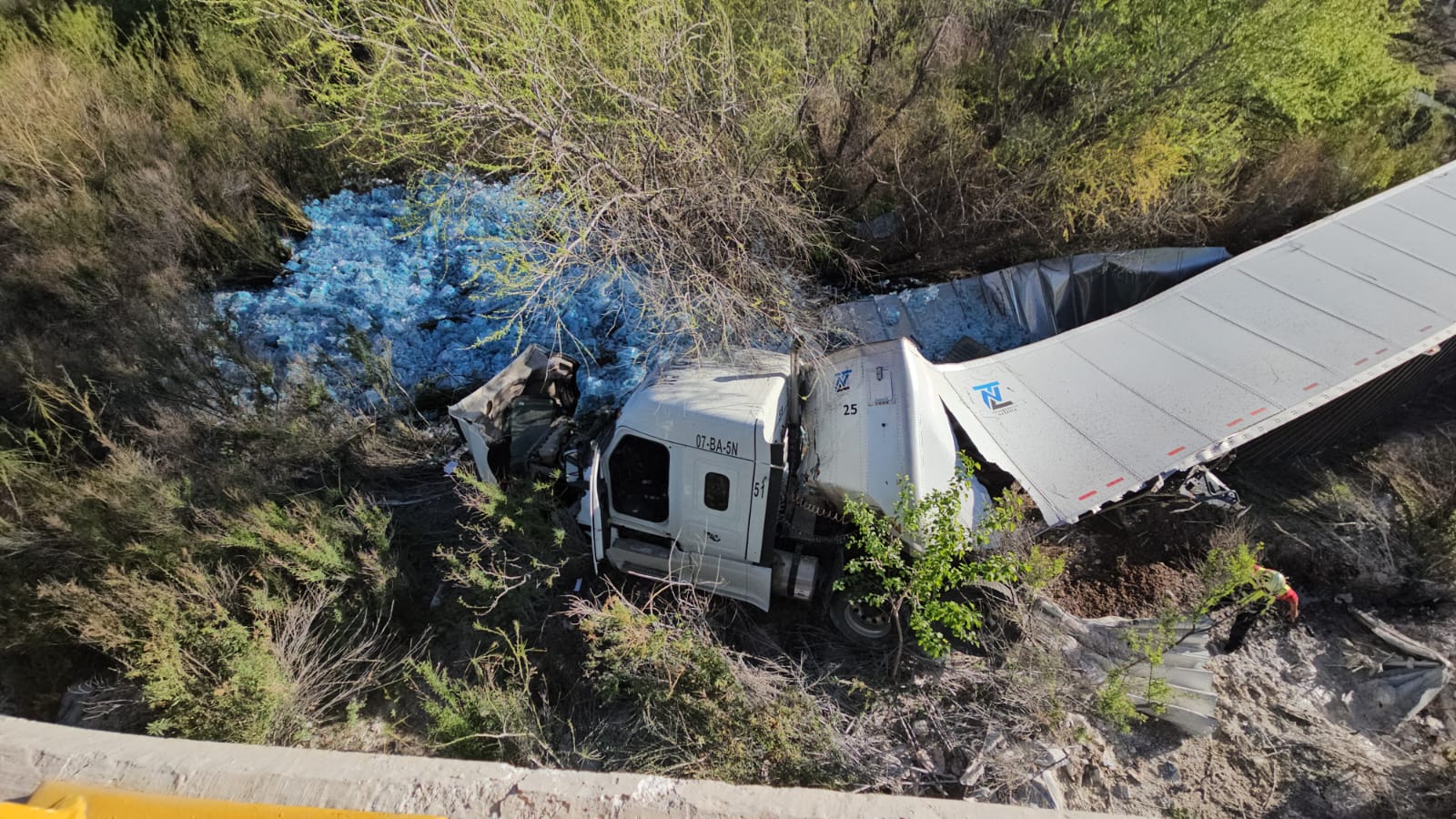 Chihuahua.- Un tráiler cargado con paquetes de agua embotellada cayó al fondo del Río Chuviscar tras volcar en el kilómetro 20+200 del Libramiento Oriente de Chihuahua.