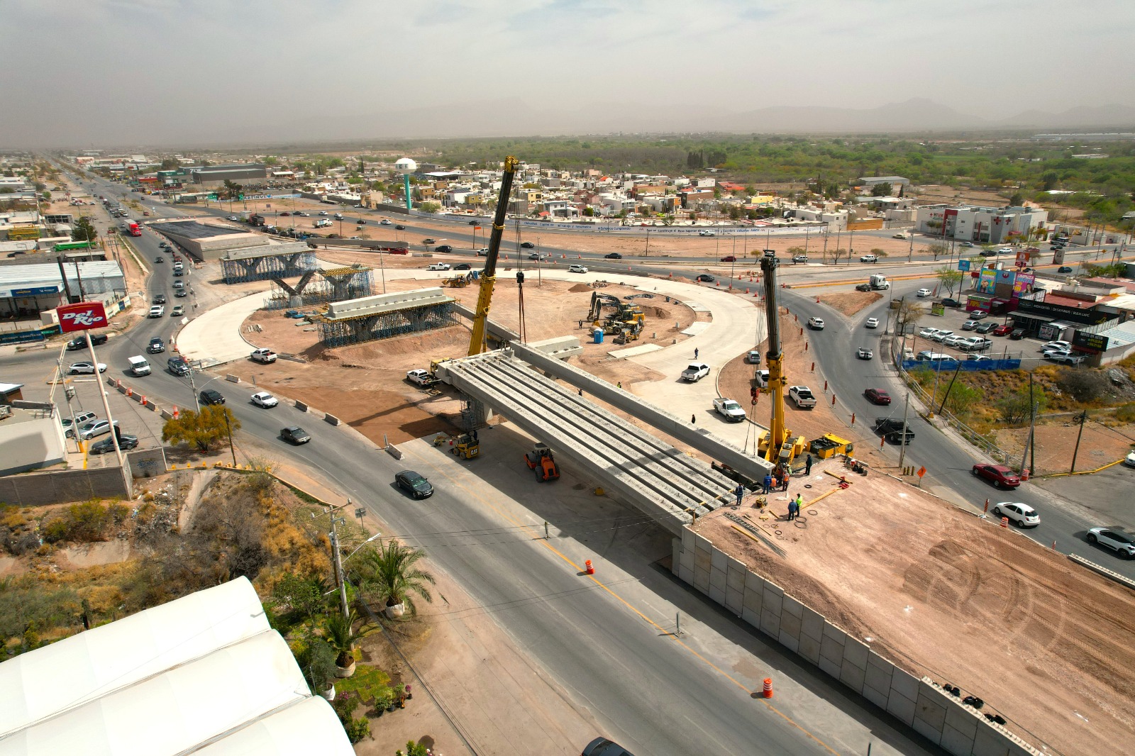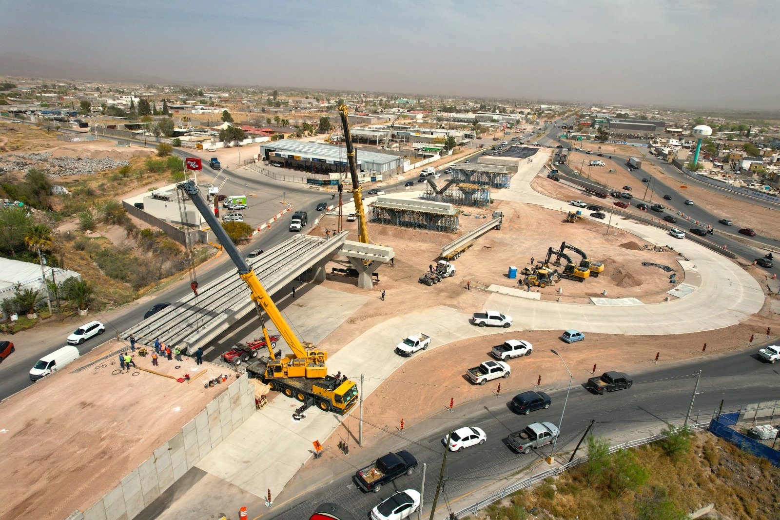 Chihuahua.- Con el firme objetivo de beneficiar a la zona oriente de Chihuahua Capital con mejores vías de acceso, el Gobierno Municipal, a través de la Dirección de Obras Públicas, llevó a cabo el montaje de las primeras trabes en el Paso Superior de la carretera Chihuahua–Aldama y avenida Fuerza Aérea, lo que significa un paso importante en el desarrollo de la superestructura.